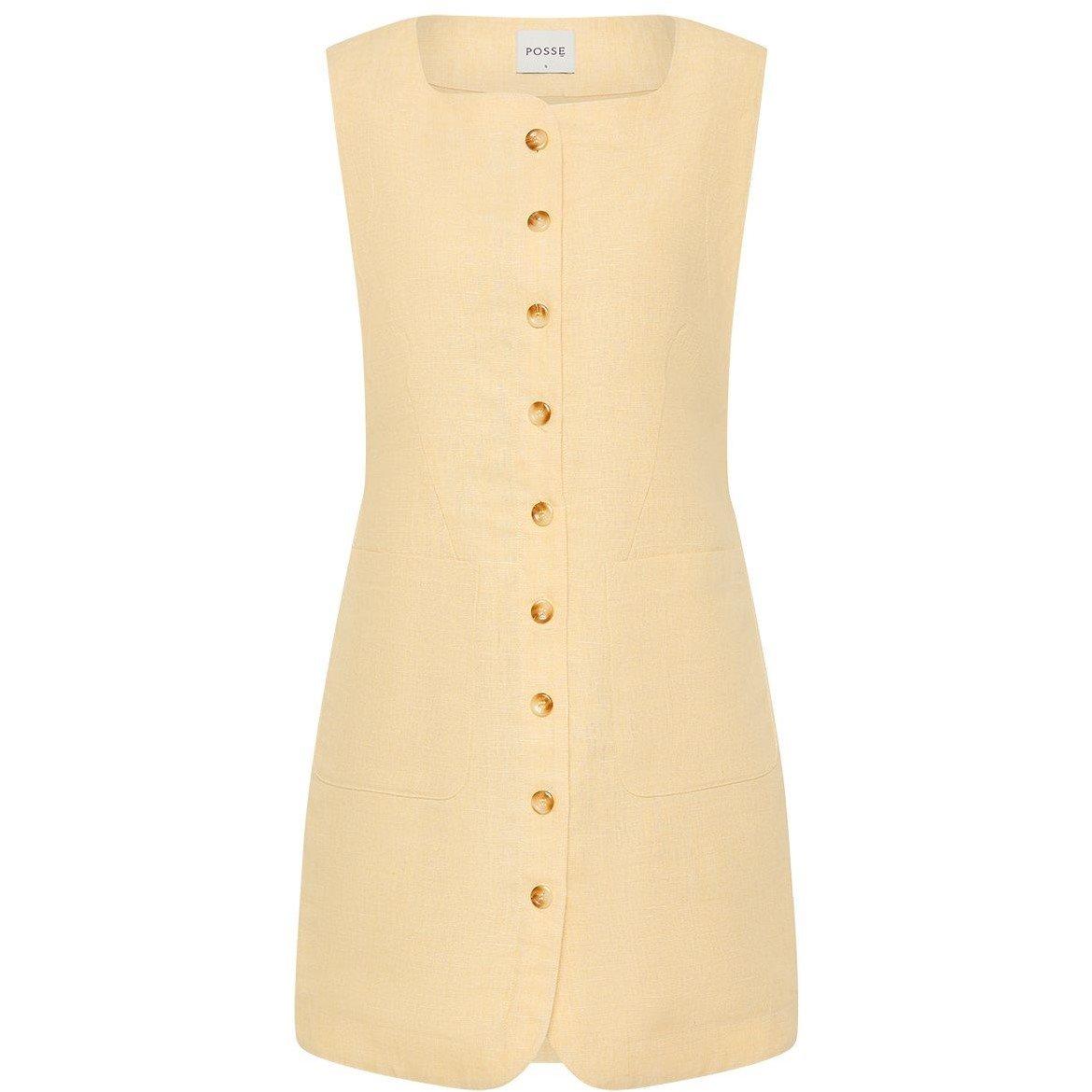 The Posse Emma Mini Dress combines effortless sophistication with luxurious minimalism.Crafted from premium linen, the high neckline, curved hem, and mottled centre-front buttons provide an elegant finish. An adjustable back buckle offers an adjustable fit at the waist for a flattering, cinched silhouette. Ideal for sunny weekend brunches, relaxed garden parties, or elevated holiday moments.