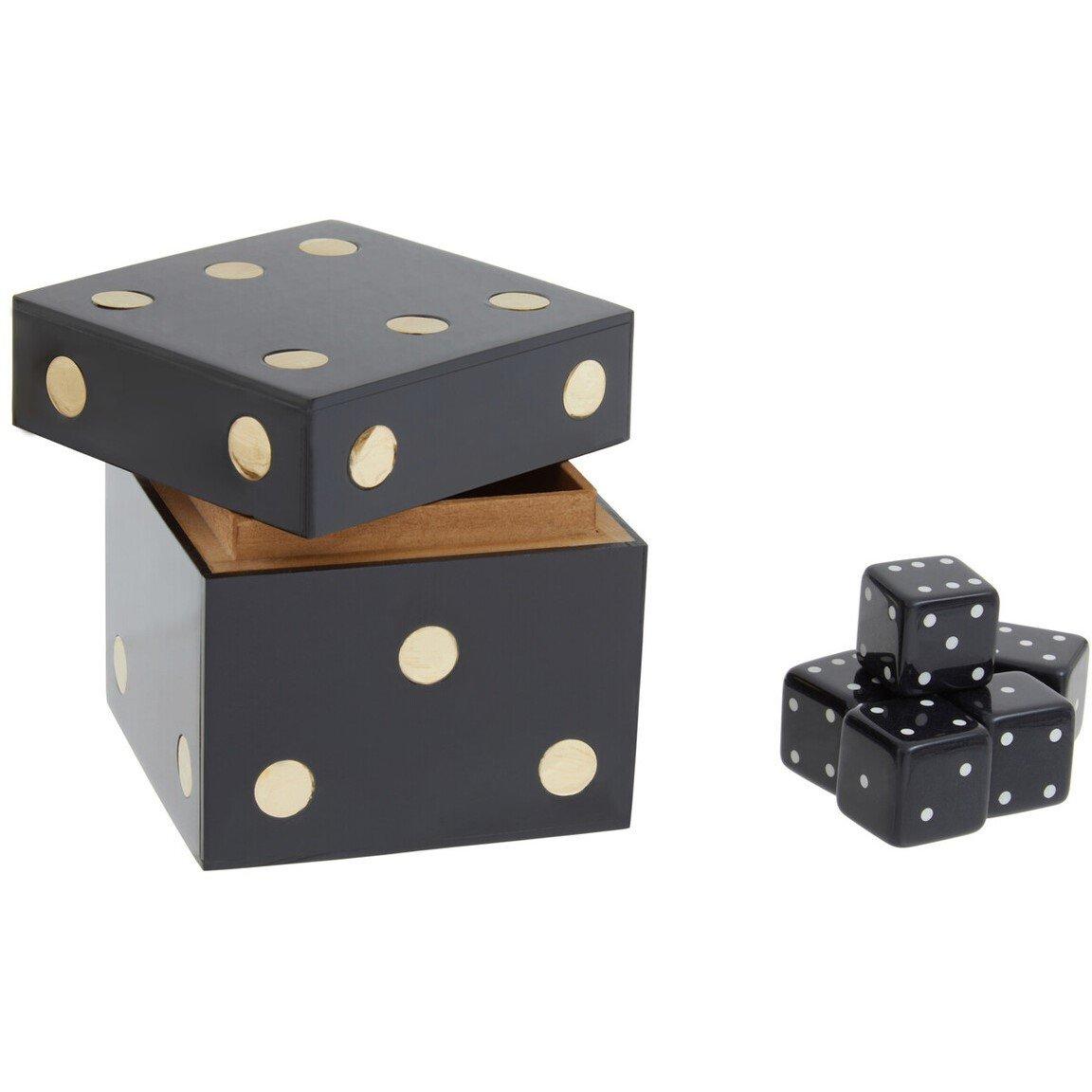 This dice box is elegantly crafted from premium quality resin and durable MDF. Boasting a gold effect detail, this game set is complemented with five dice in a black finish and brings a fun element to the living area.