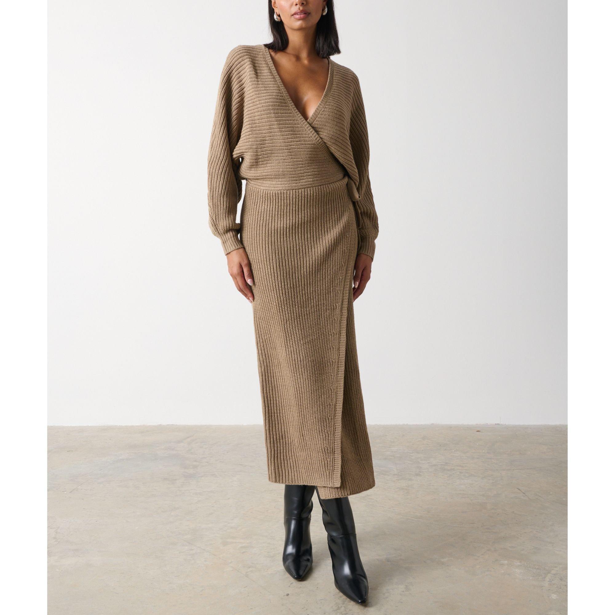 Pretty Lavish's Aidan Wrap Knitted Jumper Dress offers both comfort and contemporary styling. The wrap design creates a tailored shape while the knit offers warmth and texture.