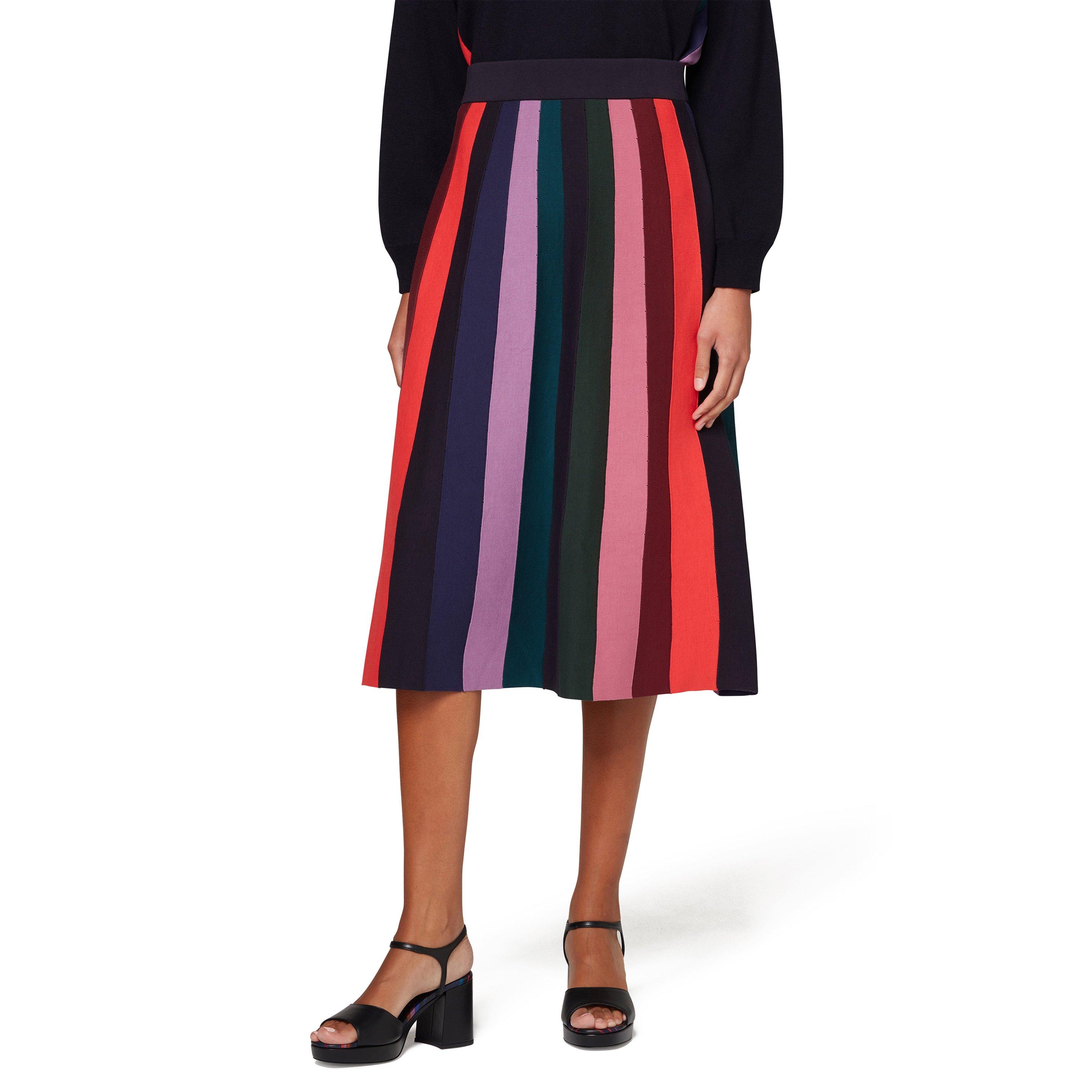 PS Paul Smith's Striped Midi Knitted Skirt features a striped pattern throughout the ribbed knit fabric. The midi length creates a flattering profile with comfortable stretch.