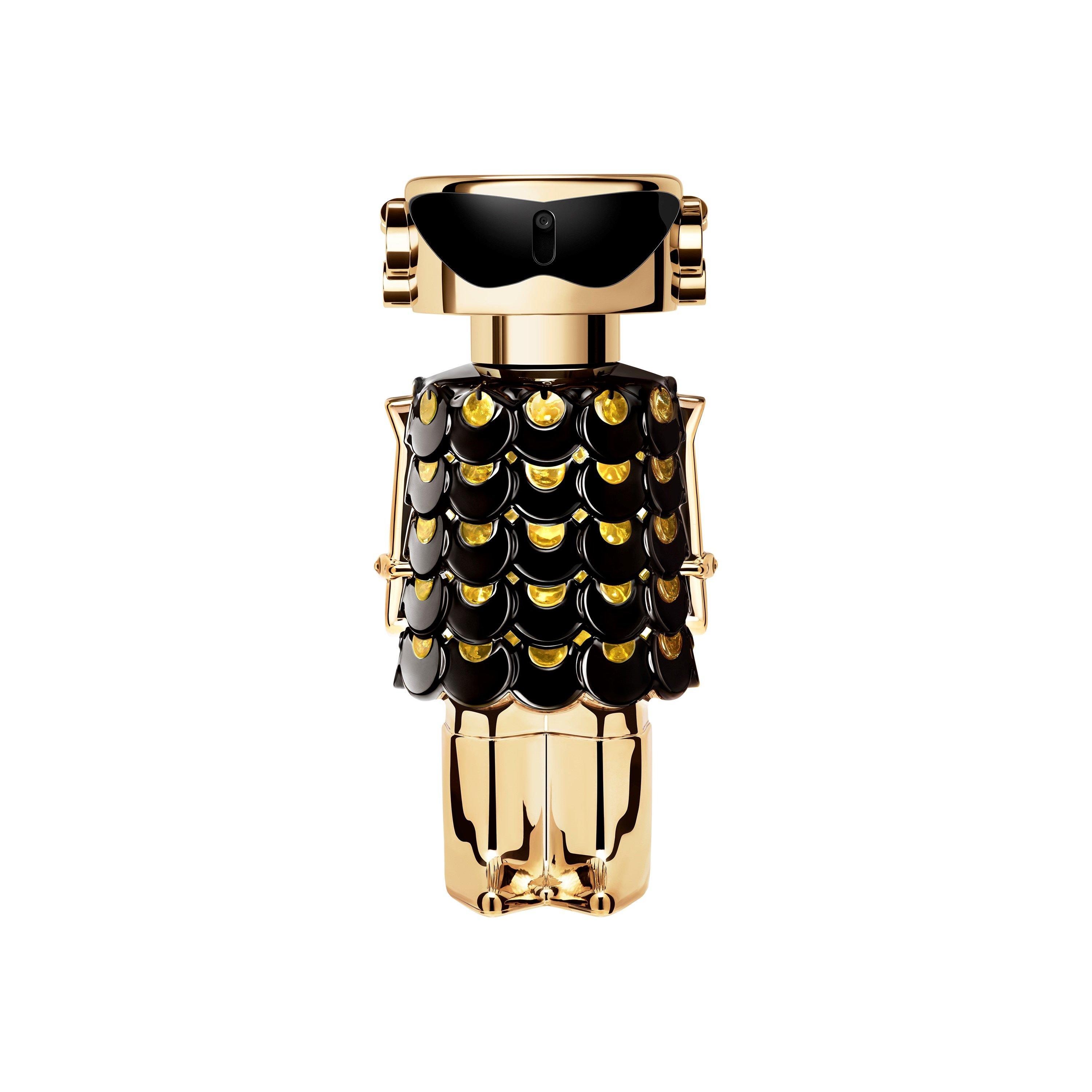THE BOTTLE Inspired by Rabanne’s legendary couture codes and unforgettable chainmail dress. As precious as jewellery; as iconic as ever: the signature golden tone of Fame gets styled with a glossy black dress to match the intensity of the champagne gold fragrance inside. Keep celebrating the magnetic feminity with the refillable format of Fame Parfum.