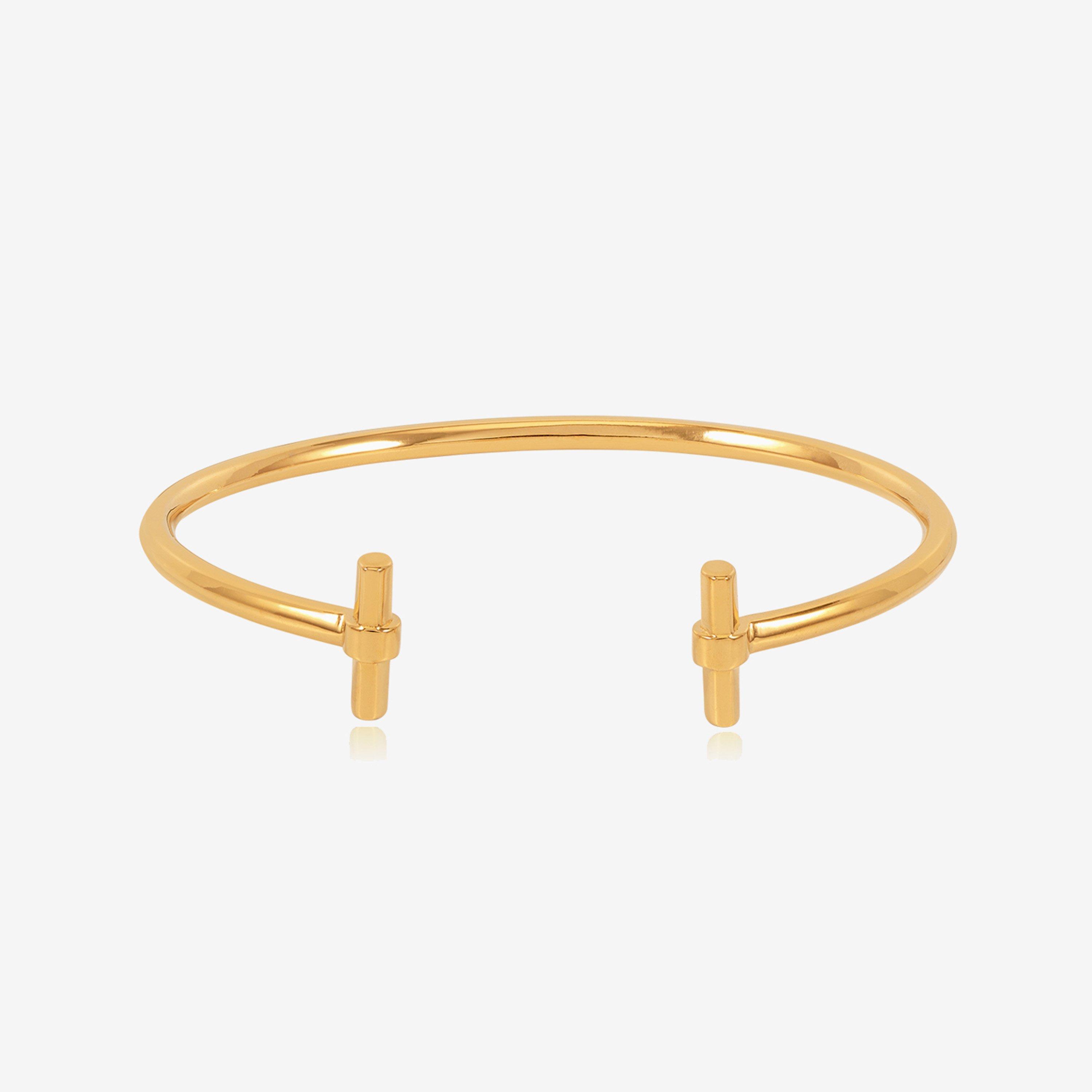 The Rachel Jackson London Adjustable T-Bar Bangle offers a streamlined profile that adapts to fit. Its open structure allows for easy adjustment while maintaining a secure hold.