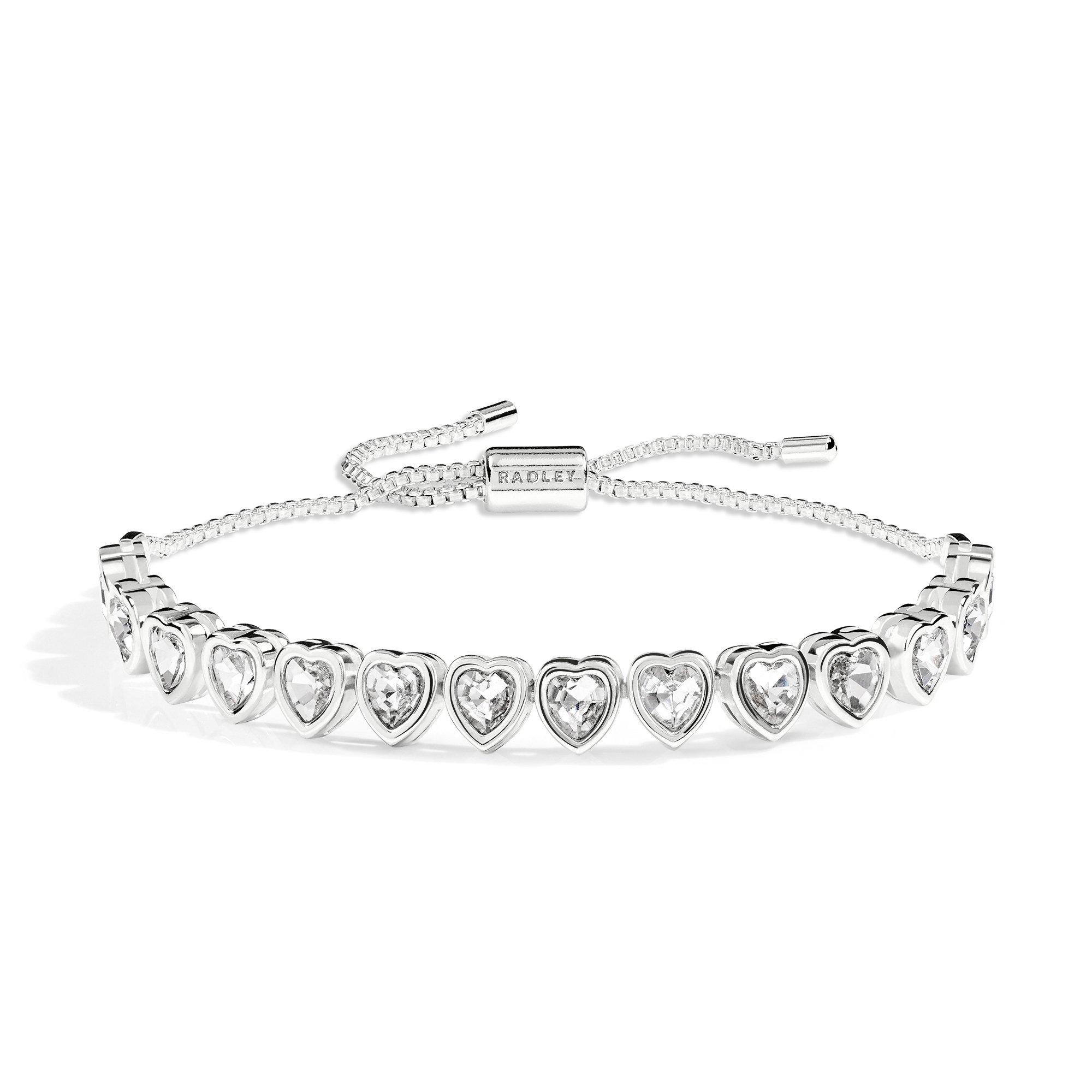Radley Silver Plated Heart Stone Set Bracelet. With a friendship style construction, this silver plated dressy bracelet features clear sparkling heartstones set into silver plated cases. This bracelet is finished with a luxe polished box chain and a cylinder slider fastening, easily adjustable for the perfect fit., Presented in a beautiful, sustainably sourced, Radley London gift box.