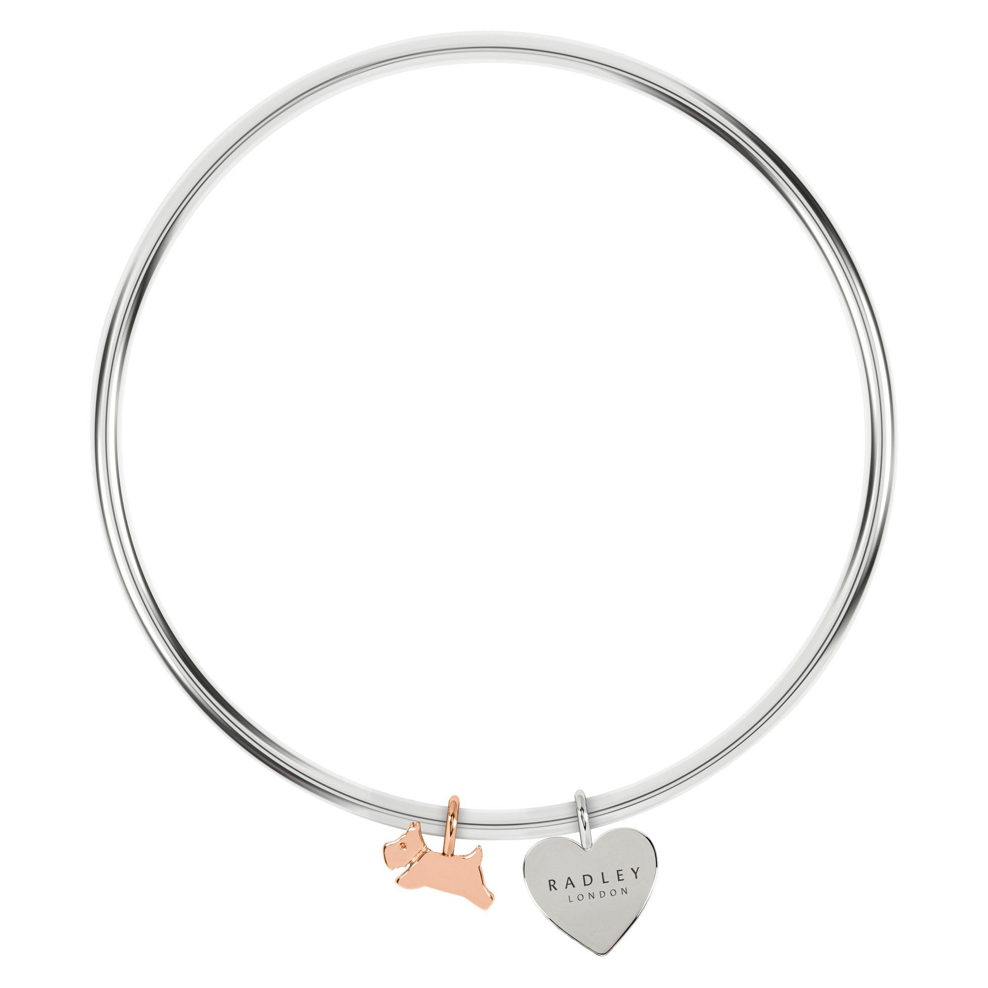Radley Ladies Silver plated hanging charm bangle. This Polished silver plated bangle features an 18ct rose gold plated jumping dog charm and a silver heart with etched Radley Logo. Includes Radley Giftable packaging.
