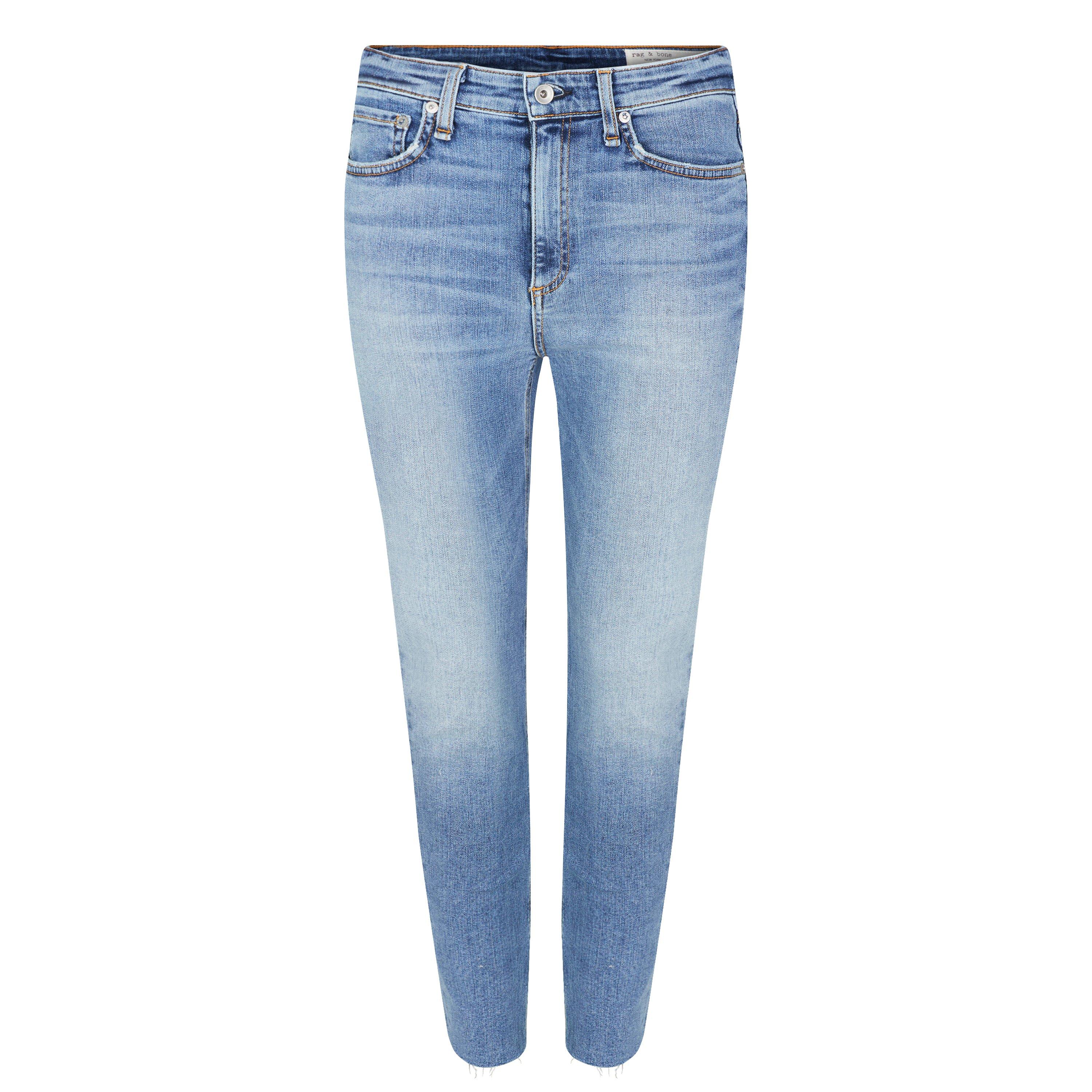 Update your basics with the High Rise Ankle Skinny Jeans by Rag and Bone. Made from a stretchy cotton blend with a zip fly fastening and belt loops the high rise waistline and raw hems offer a trendy aesthetic. With the skinny fit providing a timeless appeal, the jeans are complete with Rag and Bone branding for a high end appeal.