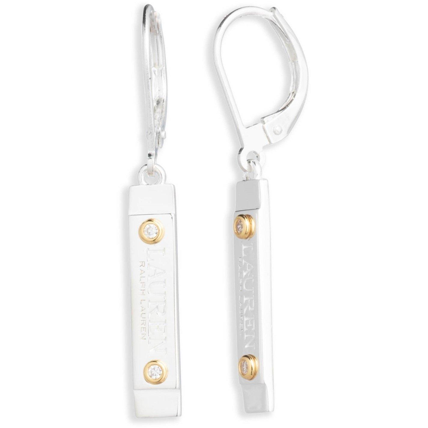 Elevate your jewellery collection with these chic bar drop earrings from Lauren Ralph Lauren. Crafted in a polished silver-tone finish, each earring features engraved branding highlighted by gold-tone accents and sparkling crystal embellishments for a touch of elegance. The sleek rectangular silhouette hangs gracefully from secure lever-back fastenings, making them perfect for both everyday wear and special occasions. Presented in an LRL pouch.