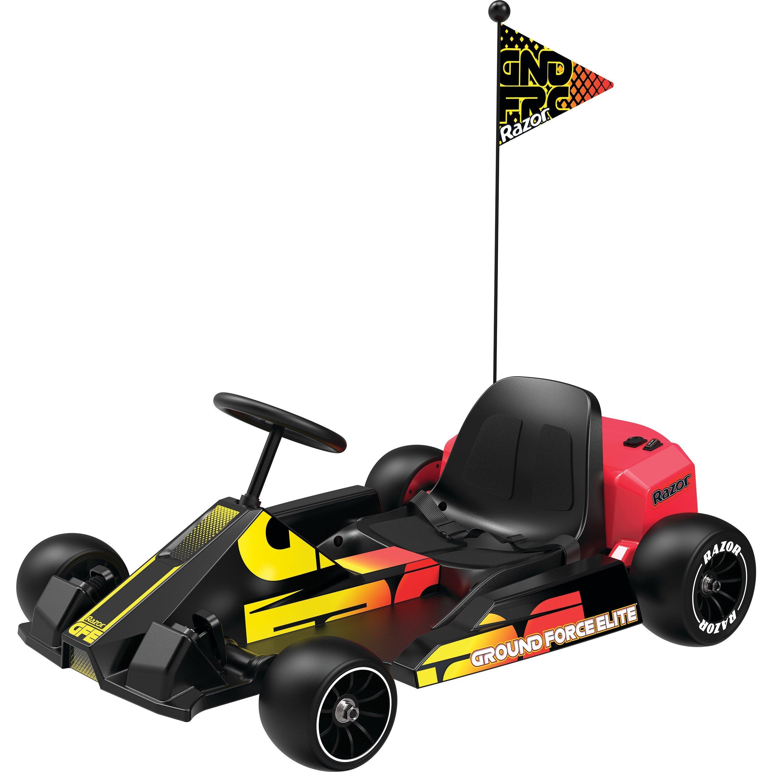 The Ground Force Elite combines shifter kart-styling, unibody construction with great manoeuvrability and enhanced steering engineered for performance. A strong 350-watt motor reaches speeds up to 14 mph and a variable speed foot pedal activated throttle provides more realistic driving experience for up to 40 minutes of continuous use, whilst the one-piece blow moulded body makes sure the wide, abrasion resistant rubber wheels are always in contact with the ground, to ensure grip which improves steering geometry and riding dynamics. The tyres are also subtlety crowned to have less rolling resistance which improves battery life and the overall speed. Designed to mimic the look of racing karts, it features bucket seat with lap strap, height adjusted steering wheel, and foot pedal activated disc brake that allows smooth and precise braking. The Ground Force Elite is Razor’s first 36-volt electric go-kart for teens that includes a forward/reverse drive switch which allows for greater control and manoeuvrability in tight spaces. Dimensions 105.1 x 73.7 x 44.8 cm, weight 30.6 kg. Maximum rider weight 91 kg. Suits ages 13 years +.