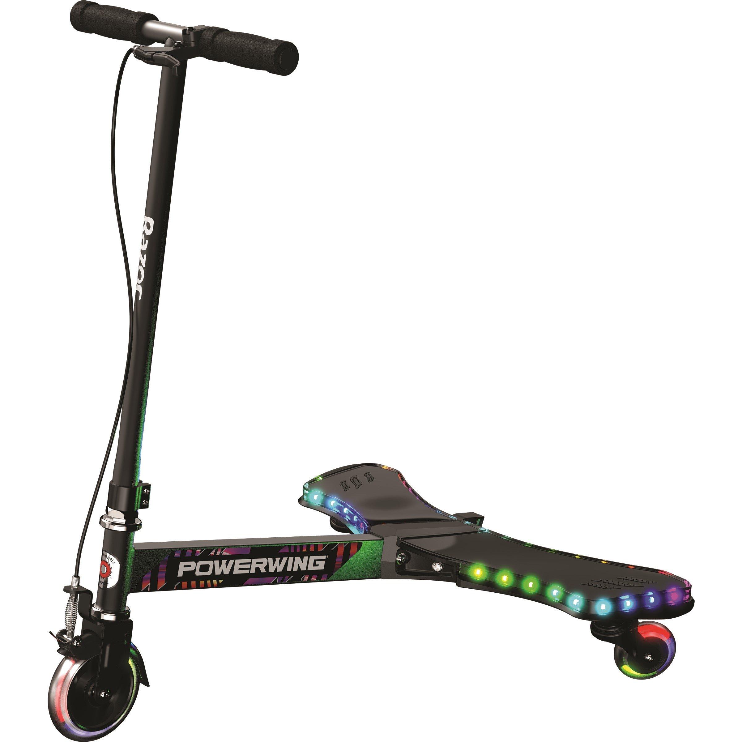 Get ready to spin and drift until the sun goes down with the unique three-wheeled Razor PowerWing Lightshow. This innovative caster scooter delivers unlimited side-to-side forward movement and features over 30 multi-coloured LED lights with five different light modes. The motion-activated light show shines through the translucent deck and urethane wheels to generate eye-popping colours. The hand- operated front fender brake and foam grips make stopping and control a breeze.