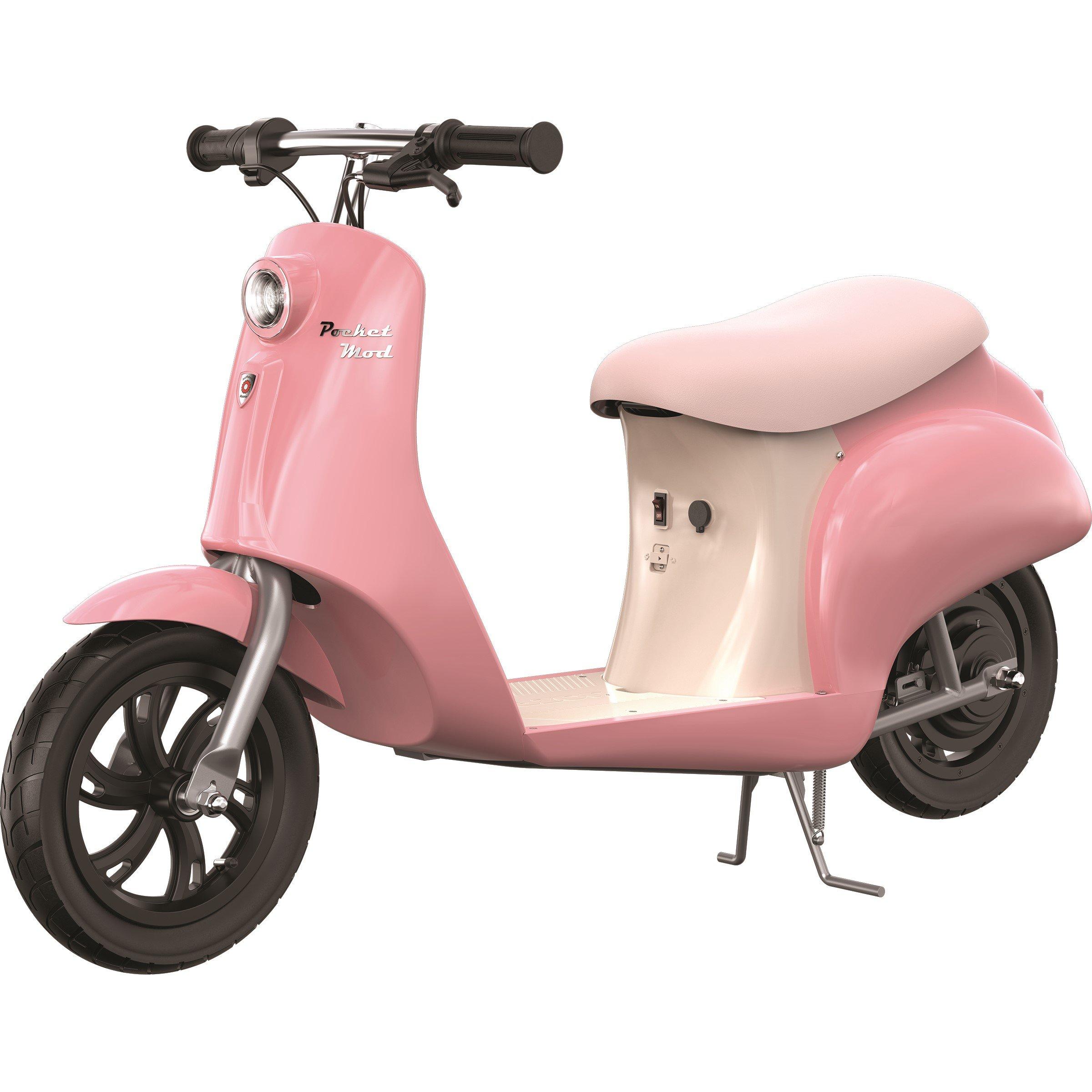 Cruise in classic European style with the Razor Pocket Mod Capri electric scooter. This vintage-inspired ride features a charming step-through steel frame finished in a vibrant pink, evoking the iconic look of Italian scooters. Designed for riders aged 8 years and older, it combines retro aesthetics with modern electric power. Driven by a high-torque, chain-driven motor and a 24-volt rechargeable battery system, the Pocket Mod Capri reaches speeds of up to 15 mph (24 km/h), offering a zippy and enjoyable ride for cruising around the neighbourhood. Enjoy journeys lasting up to 40 minutes, or covering distances up to 10 miles, on a single charge.