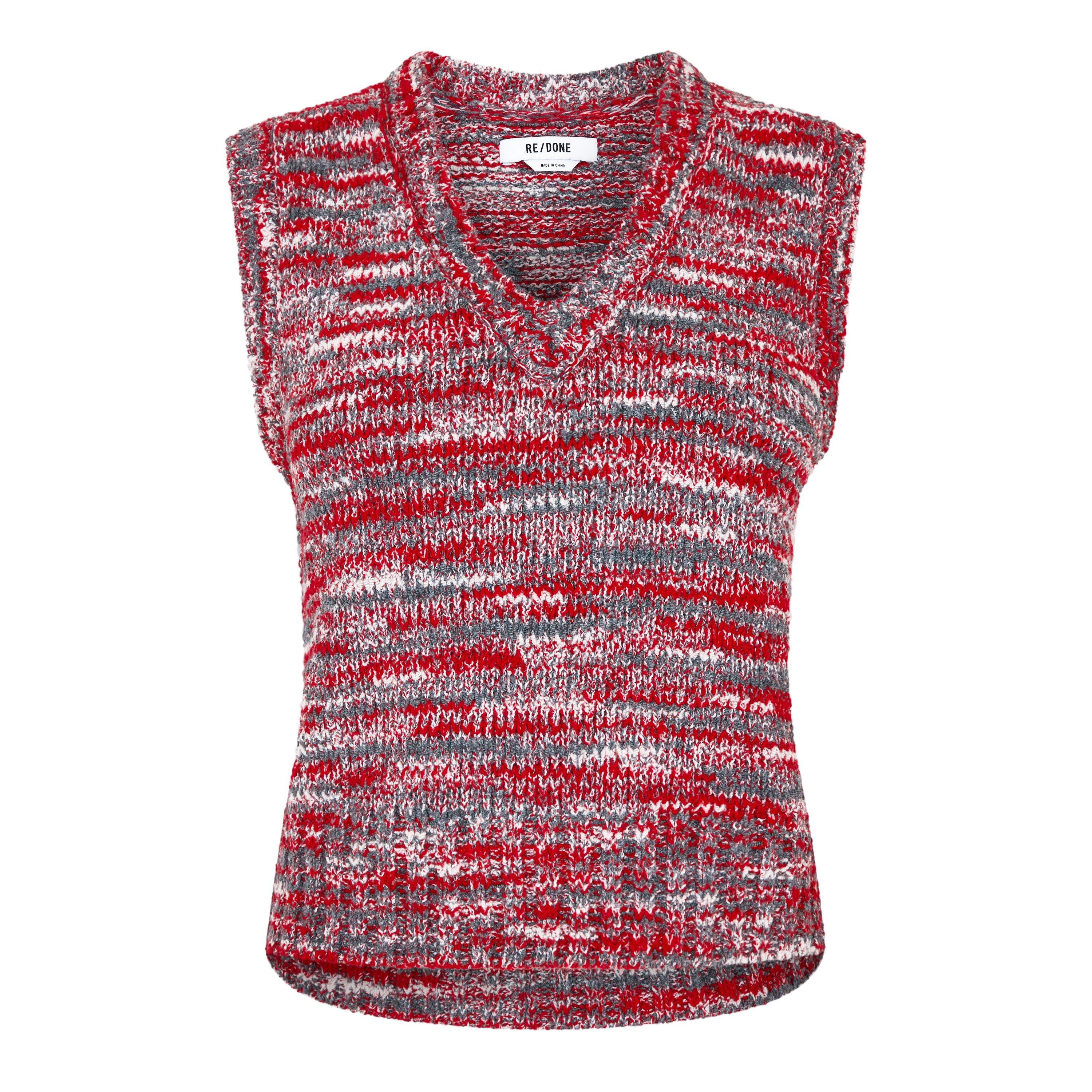 Refresh your sweater collection, with this fashionable sweater vest from Redone. Crafted from a recycled wool mix, this chunky knit styled garment comes in a slightly cropped style and sports a v neckline for a more comfortable stylish wear. It comes in a sleeveless design and features ribbed trims to detail. The look is completed in a 60s style aesthetic, multicoloured red design and would be a perfect addition to your everyday wear. Materials: 50% recycled polyamide.23%viscose 13% recycled wool, 4% cashmere. Hand wash cold, see other care instructions.