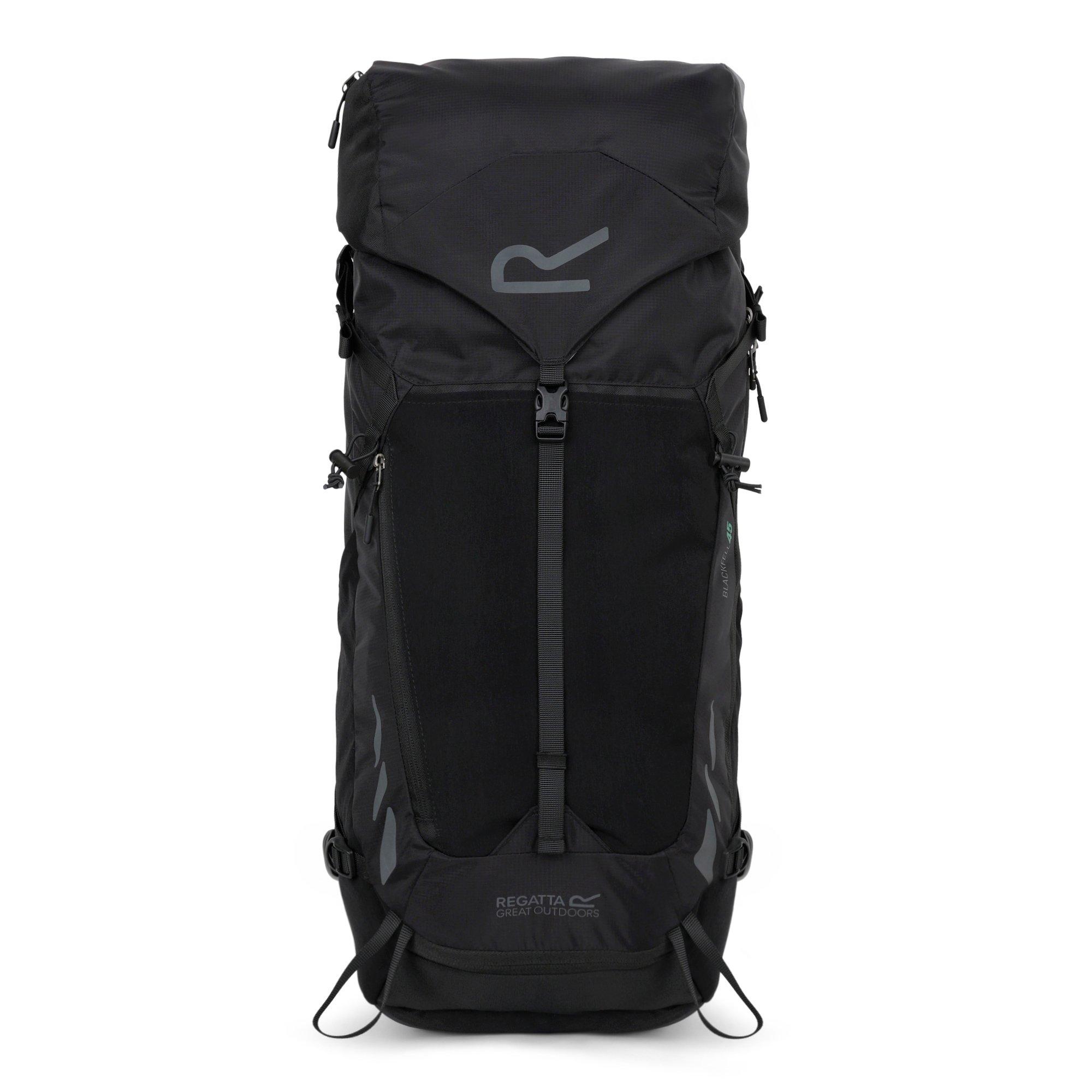 The Blackfell 4 45L medium-sized backpack from Regatta is perfect for hikes. The lightweight but durable polyamide ripstop provides lasting wear and the water-repellent finish keeps your items safe. The Tecfoam padding and air mesh fabric and ventilating channels enhance breathability to keep you fresh on the go. You'll easily stay hydrated with the convenient internal hydration storage pocket with a drinking tube retainer. The adjustable chest strap, side compression straps and low-ergonomic shoulder straps ensure a comfortable fit. The integrated emergency whistle and reflective details keep you safe. The medium hiking rucksack is finished with walking pole loops, and there's a detachable raincover for extra protection.High tenacity lightweight 210d polyamide ripstop 600D lightweight abrasion resistant polyester ERGOVENT ergonomic ventilated carry system ADJUSTFIT adjustable carry system for a personalised fit TECFOAM performance comfort STREAMAIR ventilating channels ISOFLEX fabric for expanding storage ISOVENT performance air mesh ADJUSTFITcarry system enables back length adjustment from 50cm to 58cm PFC free durable water repellent finish Top lid design with zipped lid pocket with 2L of storage Internal hydration storage pocket and drinking tube retainer Front access zip ISOFLEX expanding front and side pockets Adjustable padded hip belt Ergonomically designed shoulder straps Adjustable load lifter straps Side compression straps to adapt load Adjustable chest strap with emergency whistle Detachable raincover Zipped front pocket Reflective detail to provide high visability Walking pole loops Made with recycled content