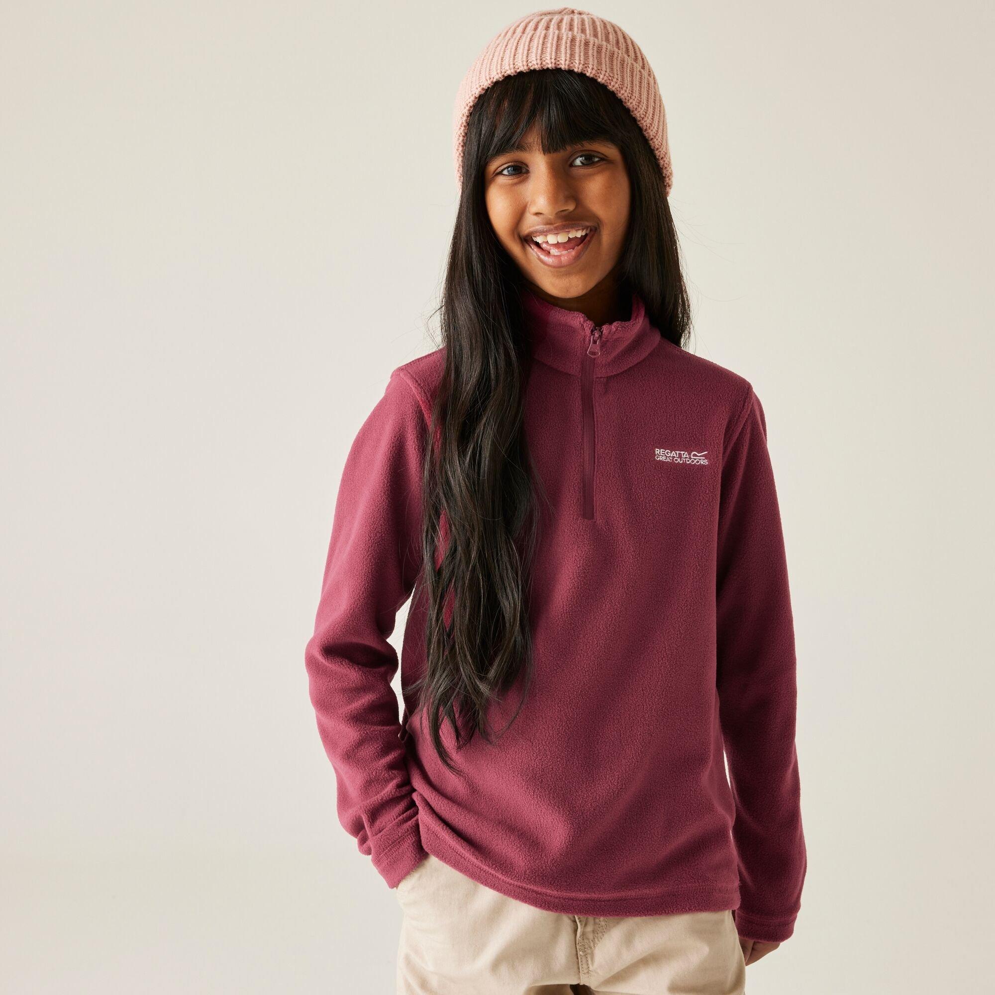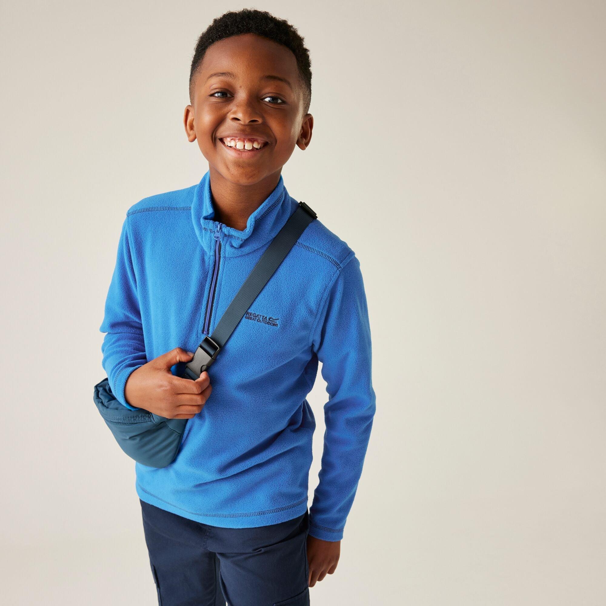 The Hot Shot II fleece from Regatta. The kids' fleece features one brushed side for a super soft feel and one anti-pill side for lasting wear on the biggest adventures. Little ones can pull down the half zip for instant air flow.