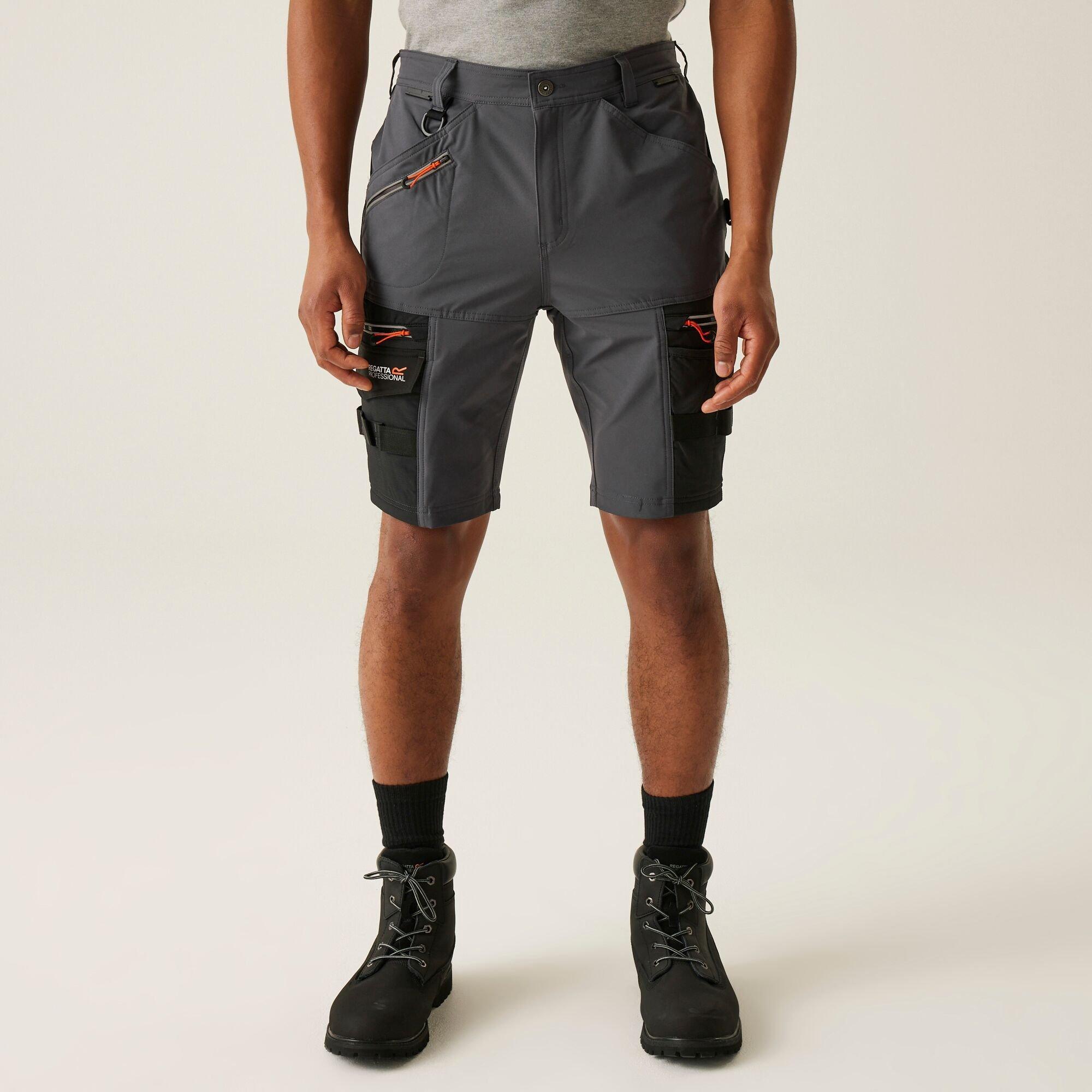 Stretchy, water-repellent and durable, our Infiltrate Shorts with Detachable Holsters are perfect for summer work. Featuring a stretchy fabric, the men's work shorts will keep you agile on the job. The workwear shorts come with a water-repellent finish to protect from summer showers and splashes. With detachable holster pockets and multiple pockets, your tools will never be far behind. 100% polyester woven stretch Softshell fabric Shaped high back waistband for comfort Durable water repellent polyester fabric Reinforced crotch seam Triple stitched seams Multiple pockets 2 front pockets 2 back pockets Reflective piping Detachable holster pockets, with slide system for optional use Belt loops Made using recycled materials Mens Work Work Workwear Work Trousers Mens Cargo Cargo Cargo Pants