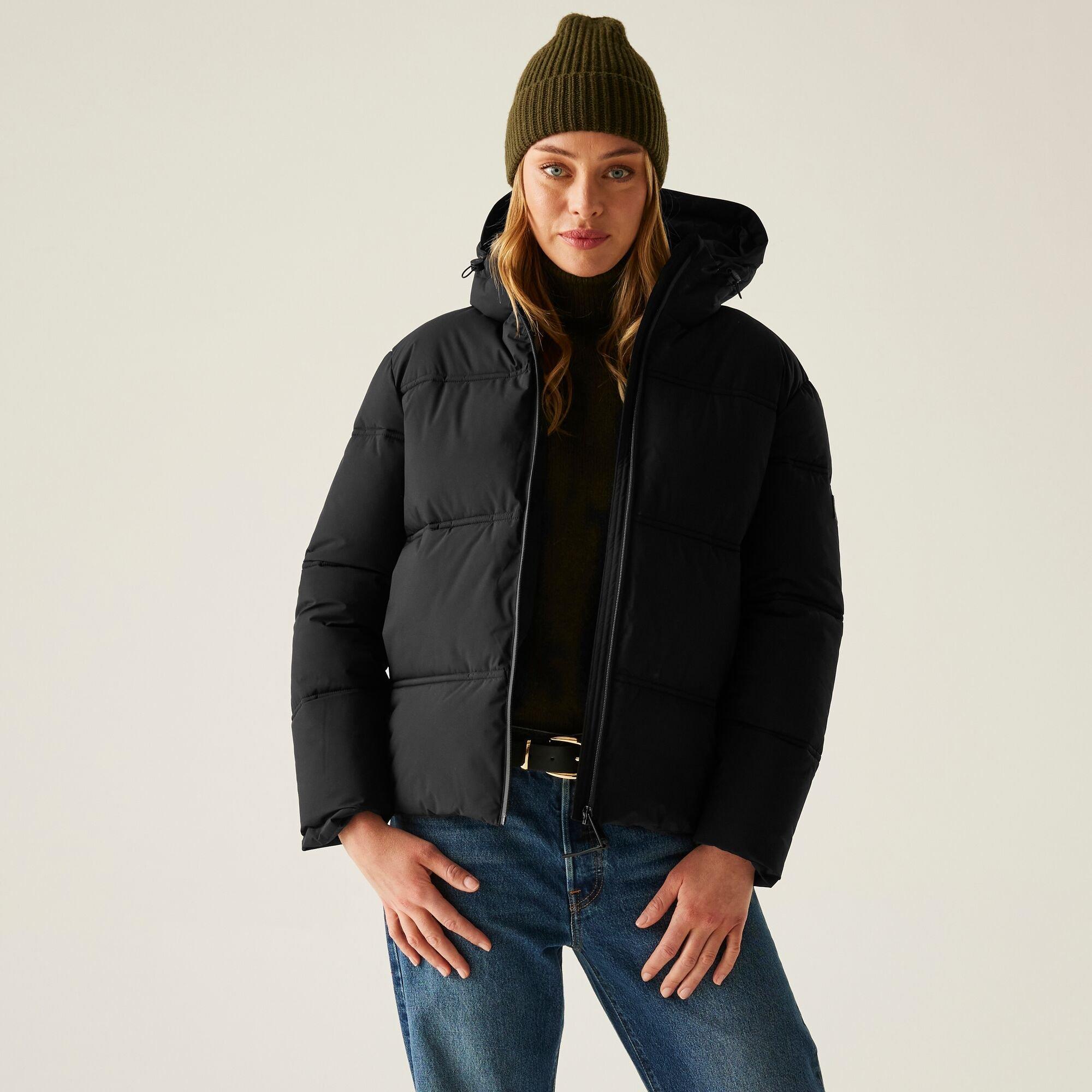 The Roxienne Water-Resistant Thermal Quilted Jacket from Regatta pairs sleek styling with technical performance. Featuring thermal insulation and a grown-on hood, this essential outdoor coat delivers protection against the elements with its flexible design and adjustable lower edge.