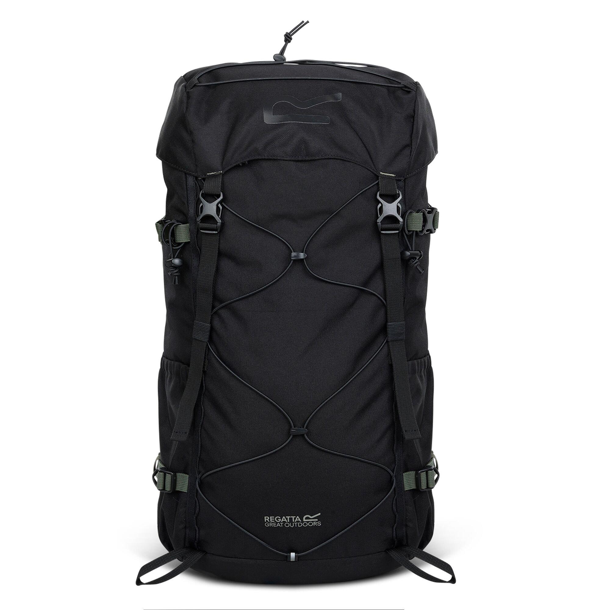 The Survivor 5 35L rucksack from Regatta is perfect for your weekend adventures. The large hiking backpack is made from durable water-repellent fabric ensuring reliability in various weather conditions. The top lid design with zip pocket provides secure and easy access to essentials. You'll stay comfy and fresh with the padded air mesh back panel, padded shoulder straps, adjustable sternum strap and metal back struts. Staying hydrated on-the-go comes with ease thanks to the internal hydration storage pocket and side bottle pockets. The large-size rucksack is packed with handy features including an internal key clip, easy grab zip pullers and daisy chain clipping points for additional gear.Top lid design with large zipped pocket Padded Air Mesh back panel for moisture management Metal back struts for improved stability Large main compartment Internal hydration storage pocket and drinking tube retainer External side bottle pockets Top bungee storage system Front bungee storage system Side compression straps Padded shoulder straps Adjustable load lifter straps Adjustable sternum strap Adjustable hip belt Durable water repellent fabric Integral bungee walking pole holders Detachable raincover Reflective detail to provide high visability Internal key clip Grab handle Easy grab zip pullers Daisy chain clipping points Made with recycled content