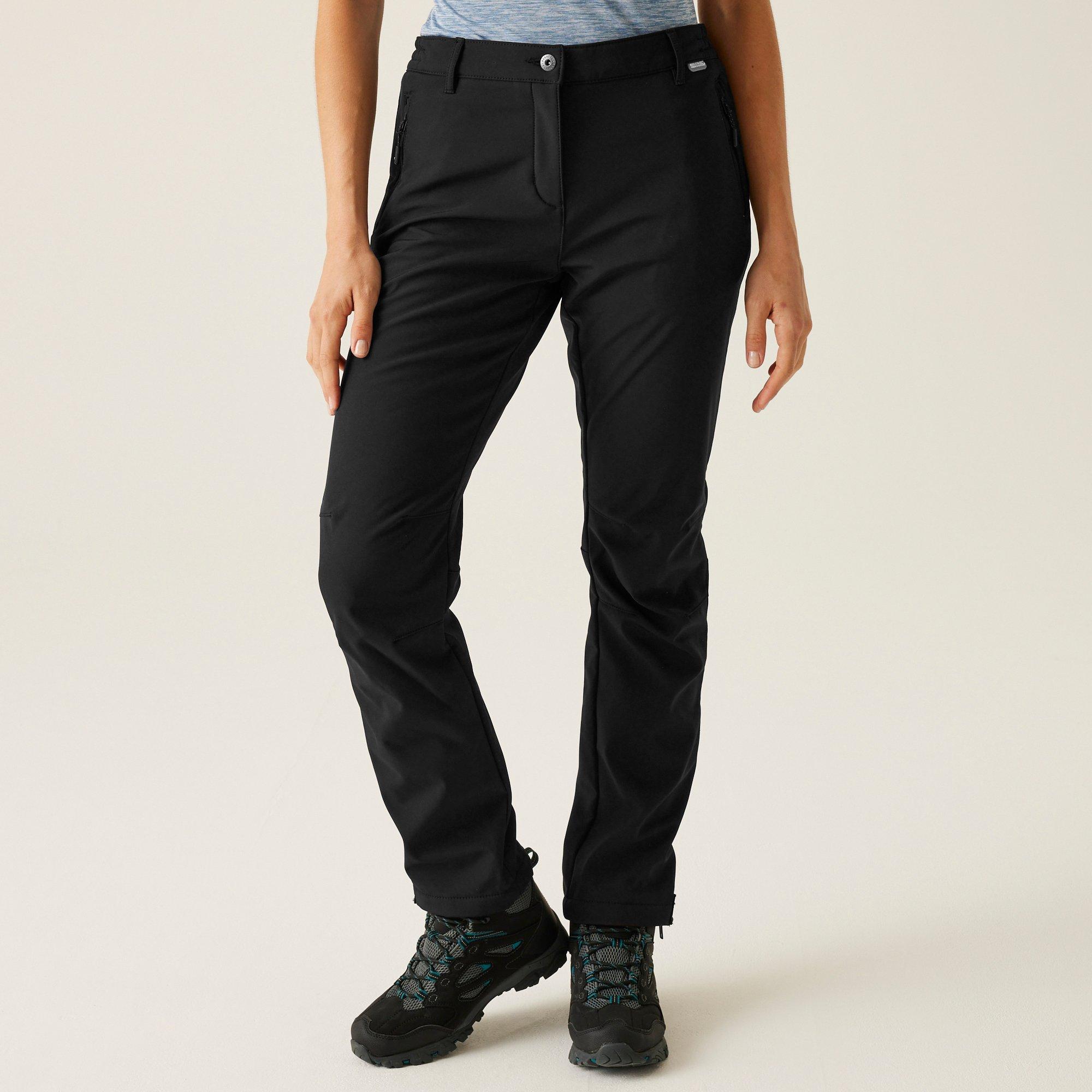 The Women's Geo Softshell trousers II from Regatta. These hardwearing trousers are made for adventures. They're waterproof and windproof making them perfect for changeable weather. The part elasticated waist on the women's softshell trousers keeps you agile. Available in short regular and long lengths.
