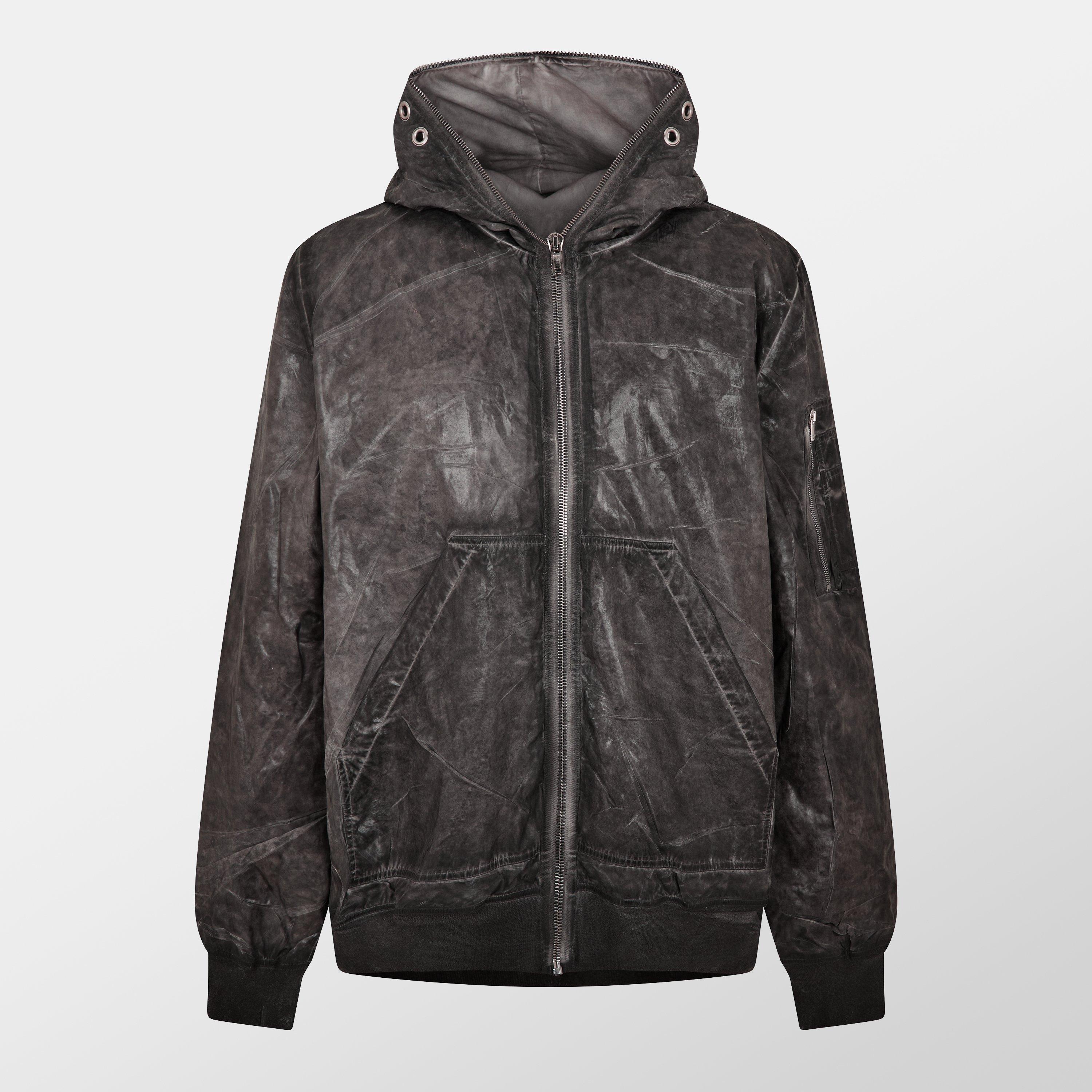 The Rick Owens Drkshdw Gimp Flight Bomber Hooded Parka showcases the brand's design approach with its full-zip hood featuring eye slits and metal eyelets. This bold outerwear piece merges bomber jacket elements with innovative design details for a striking shape.