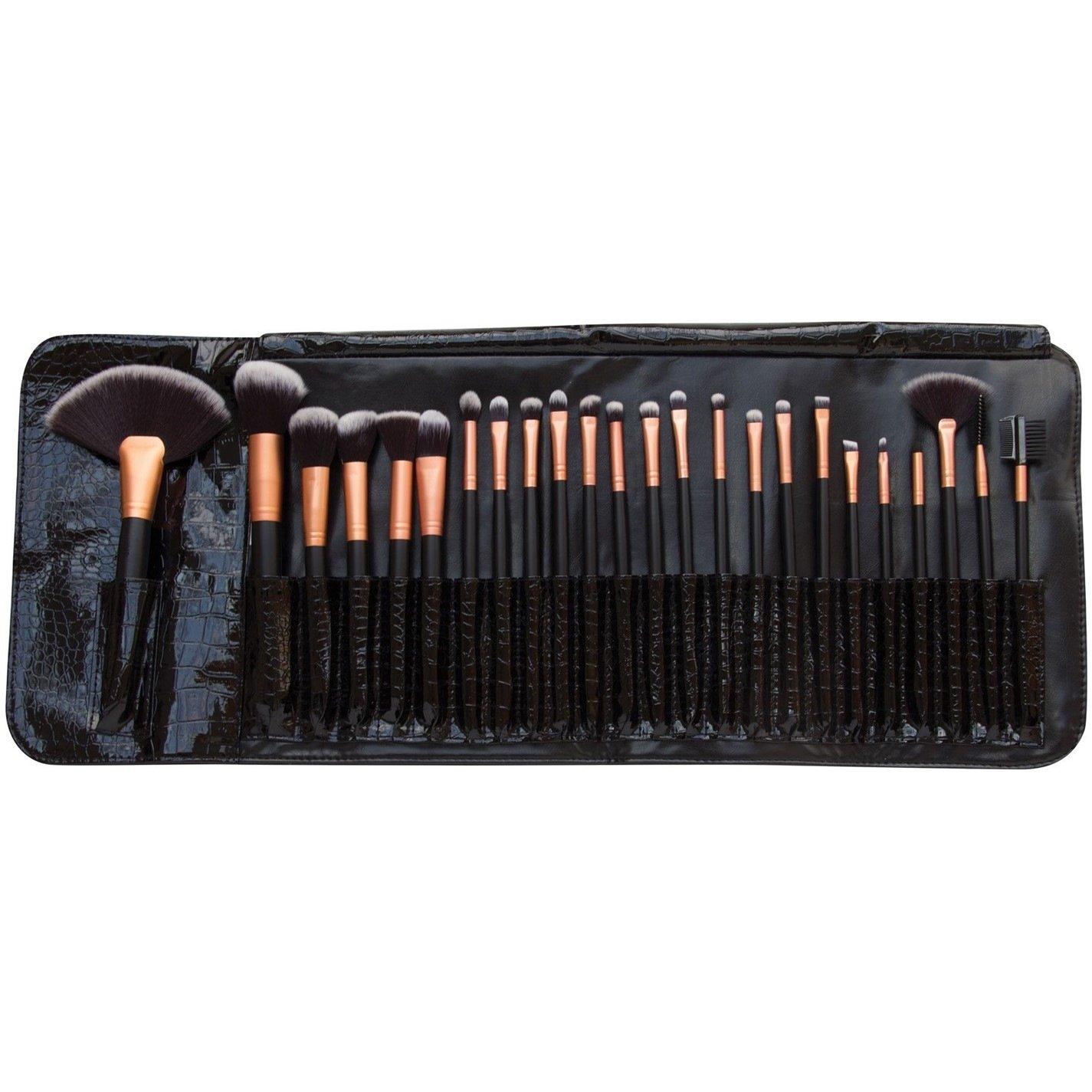 24 professional cosmetic brushes Presented in a luxury synthetic leather roll travel pouch for protecting and maintaining brush conditioning.