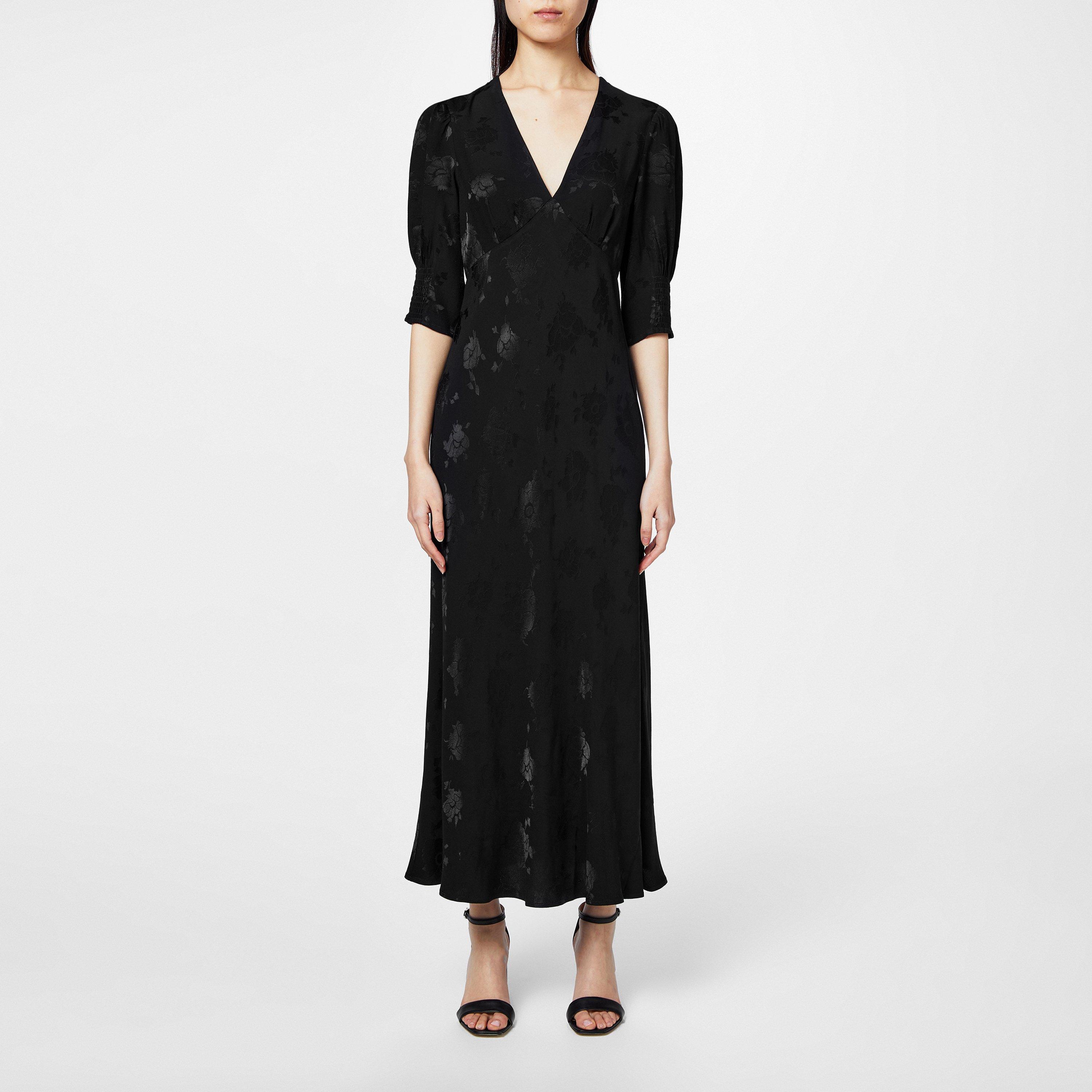The RIXO Zadie Midi Dress is cut to a midi length with a jacquard pattern. The V-neck and short sleeves keep the shape streamlined and easy to wear.