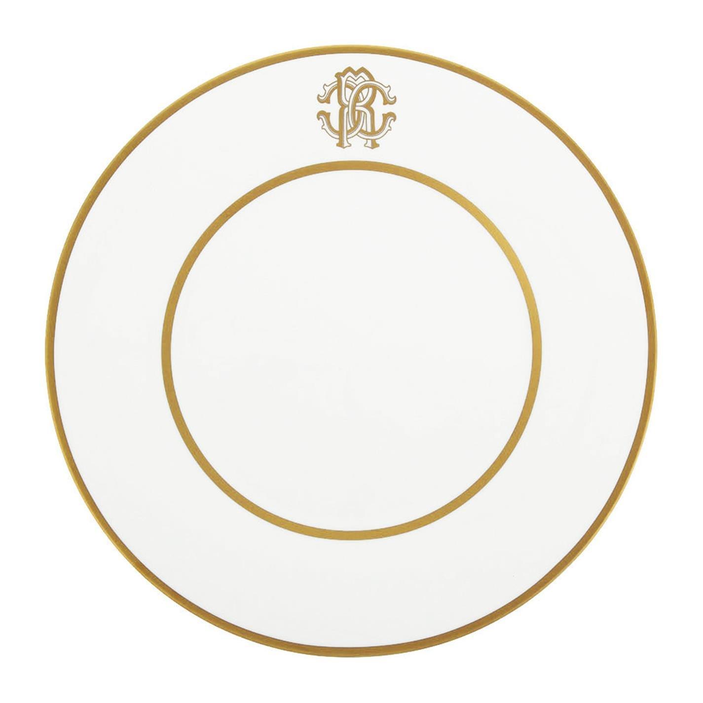 Add subtle opulence to any setting with this Silk Gold charger plate from Roberto Cavalli. Crafted from fine bone china, this plate has a sleek plain white design with decadent gold coloured rims and RC monogram. Part of the Silk Gold collection, this range beautifully combines with other tableware designs from the world renowned fashion brand.