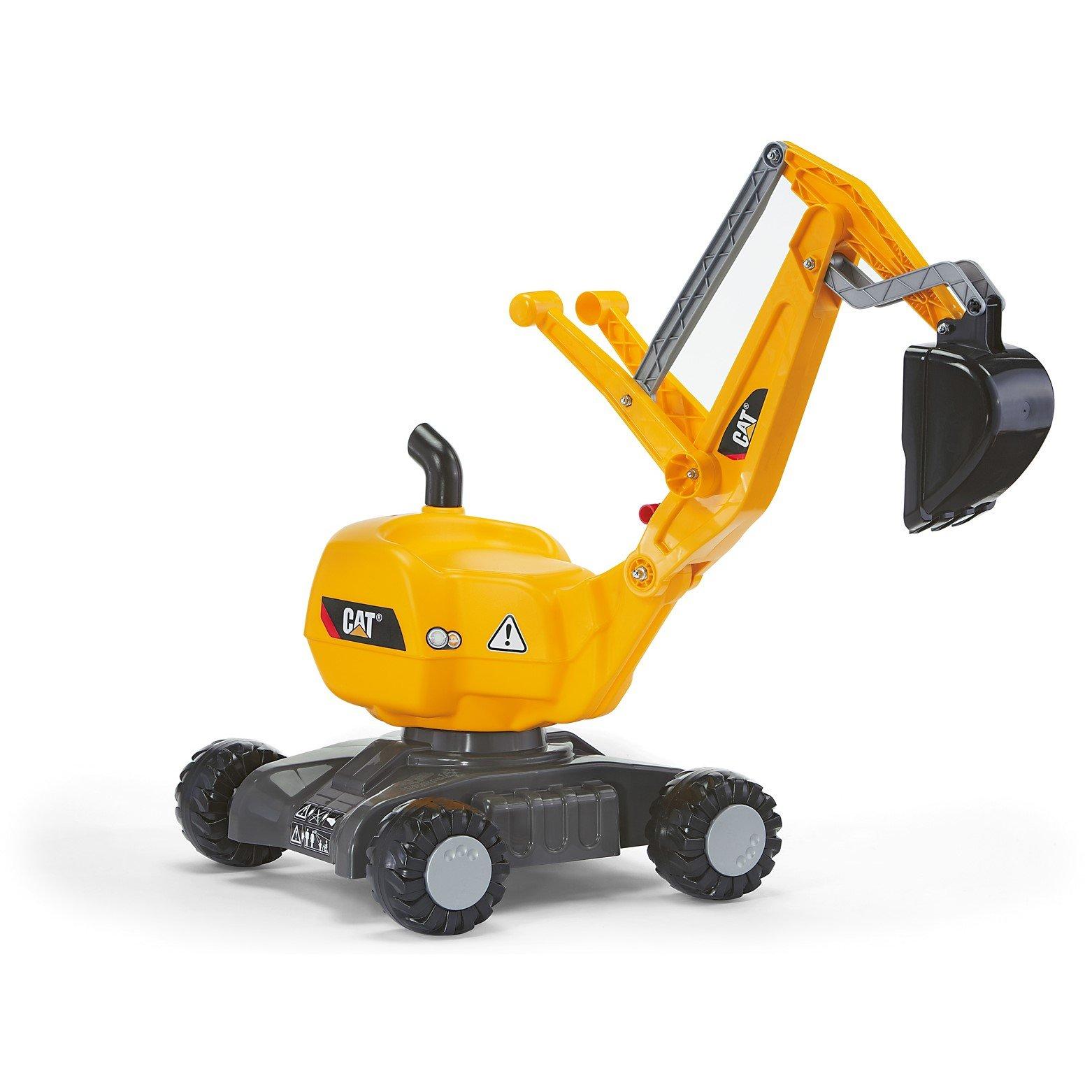 This large Caterpillar excavator features a realistic mechanism using two hand operated levers allowing material to be scooped up and deposited elsewhere. Also has an automatic locking arm. The digger unit can spin through 360 degrees on its base which has four sturdy wheels that allows it to move along like a foot to floor toy. Suitable age 3 plus years.