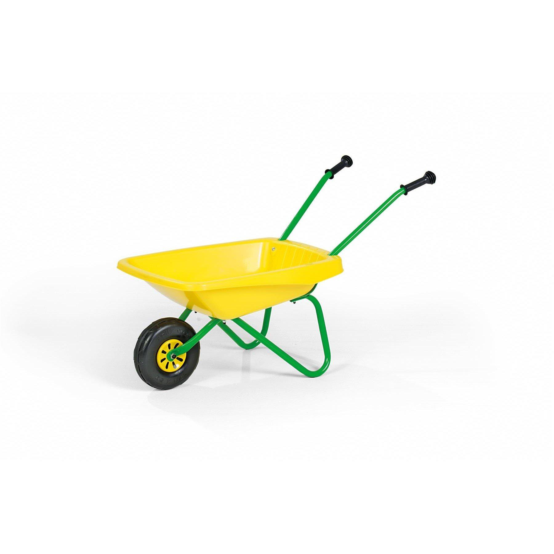 This large framed children's wheelbarrow has a sturdy bucket, rubber handgrips and a front wheel for stability. The wheelbarrow is easily assembled and has a load capacity of approximately 25kg.