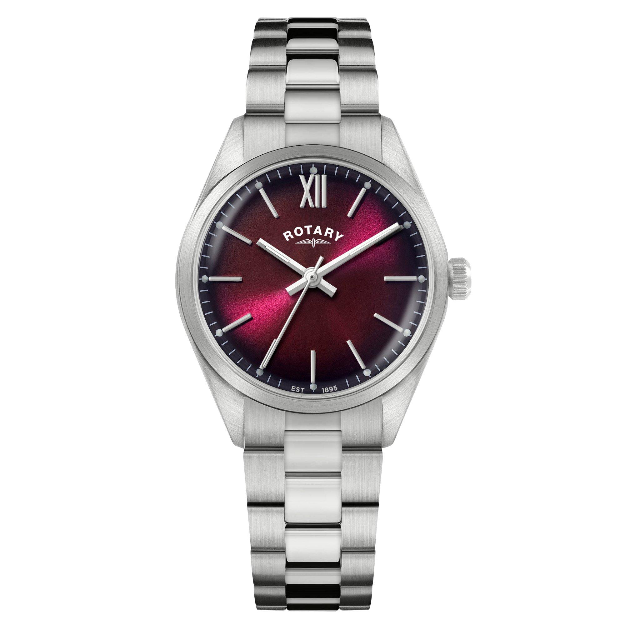 Refined, minimal, and timeless, this Rotary Heritage watch is a masterclass in understated sophistication. Featuring a rich red dial framed by polished hour markers and slender baton hands. Housed in a sleek stainless steel case and paired with a matching three-link bracelet, it exudes effortless elegance for both casual and formal occasions. Powered by a reliable quartz movement and protected by a flat sapphire crystal, this timepiece combines classic design with modern durability. A subtle date window at 6 o,clock adds function without compromising the dial,s symmetry, making it a versatile everyday companion.