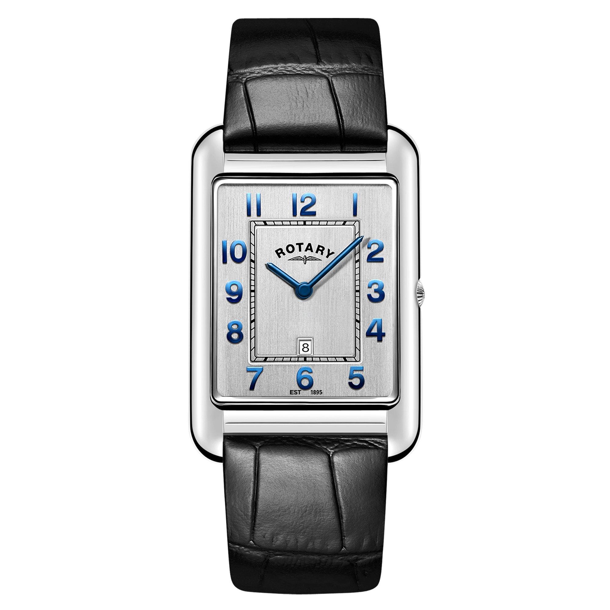 To complete the classic sensibility of the design, a black leather strap frames the case and is secured with a Rotary buckle. Powered by a reliable quartz movement, the timepiece is also water resistant to 50m for all-day wear.
