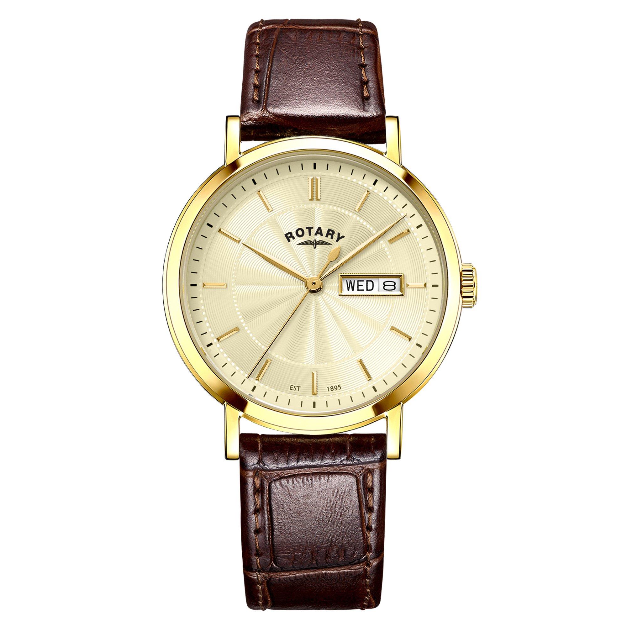 Expertly crafted with gold PVD and sapphire glass, this Rotary Heritage timepiece features applied baton indices over a champagne guilloche dial and outer minute track.