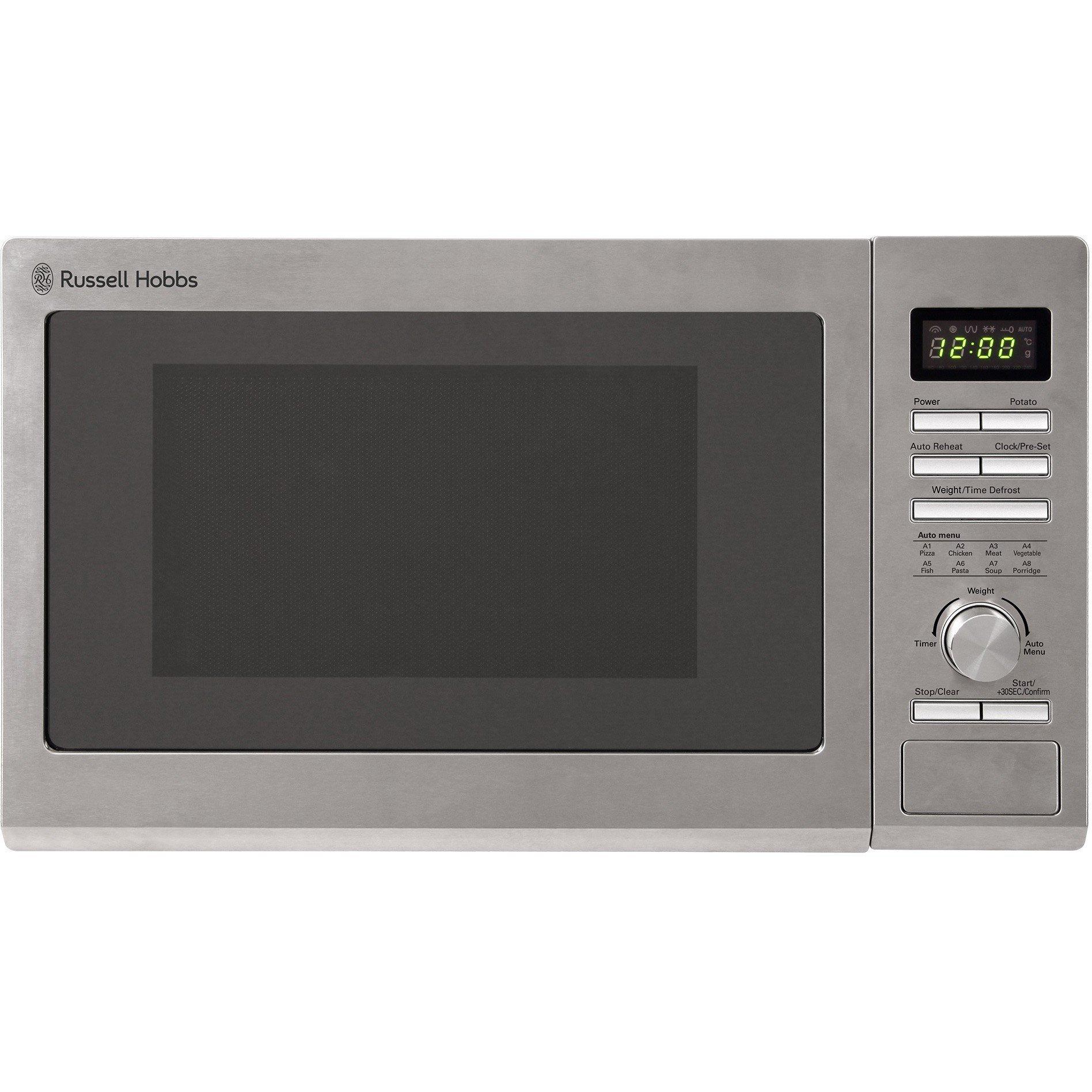 The Russell Hobbs RHM2563 microwave has a stylish and professional design, boasting an attractive mirror door finish. As well as an appealing look, this appliance also includes impressive functionality, with 900 watts of microwave power providing quick and convenient cooking in your home. With a spacious 25 litre cavity capacity this microwave can comfortably fit a large sized dinner plate. Plus, the removable and dishwasher safe glass turn-table means it’s super easy to keep clean. The handy pre-programmed auto cook menus, such as pizza (reheat), fish, and popcorn, allow you to cook all your favourite foods at the push of a button. What's more, there's automatic defrost settings meaning all you have to do is input the weight of the food, and the microwave selects the ideal defrost time, saving you time and effort. With 5 microwave power levels it's easy to tailor your cooking experience to every dish. Additional features include a handy digital clock and count-down timer and the RHM2563 comes with a child safety lock option. When the child lock is on, it locks the control buttons so the microwave cannot be activated for added peace of mind.