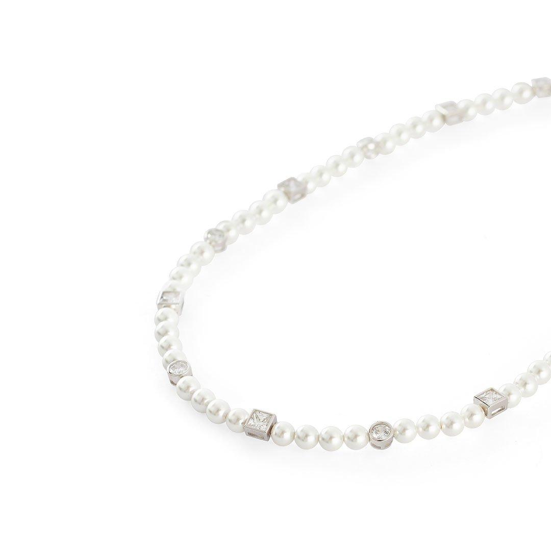 The Regal Pearl Necklace is a classic pearl necklace with cushion and circular cut gems throughout. The necklace is made with a shell pearls, 925 Sterling Silver clasp & a strong plastic thread.