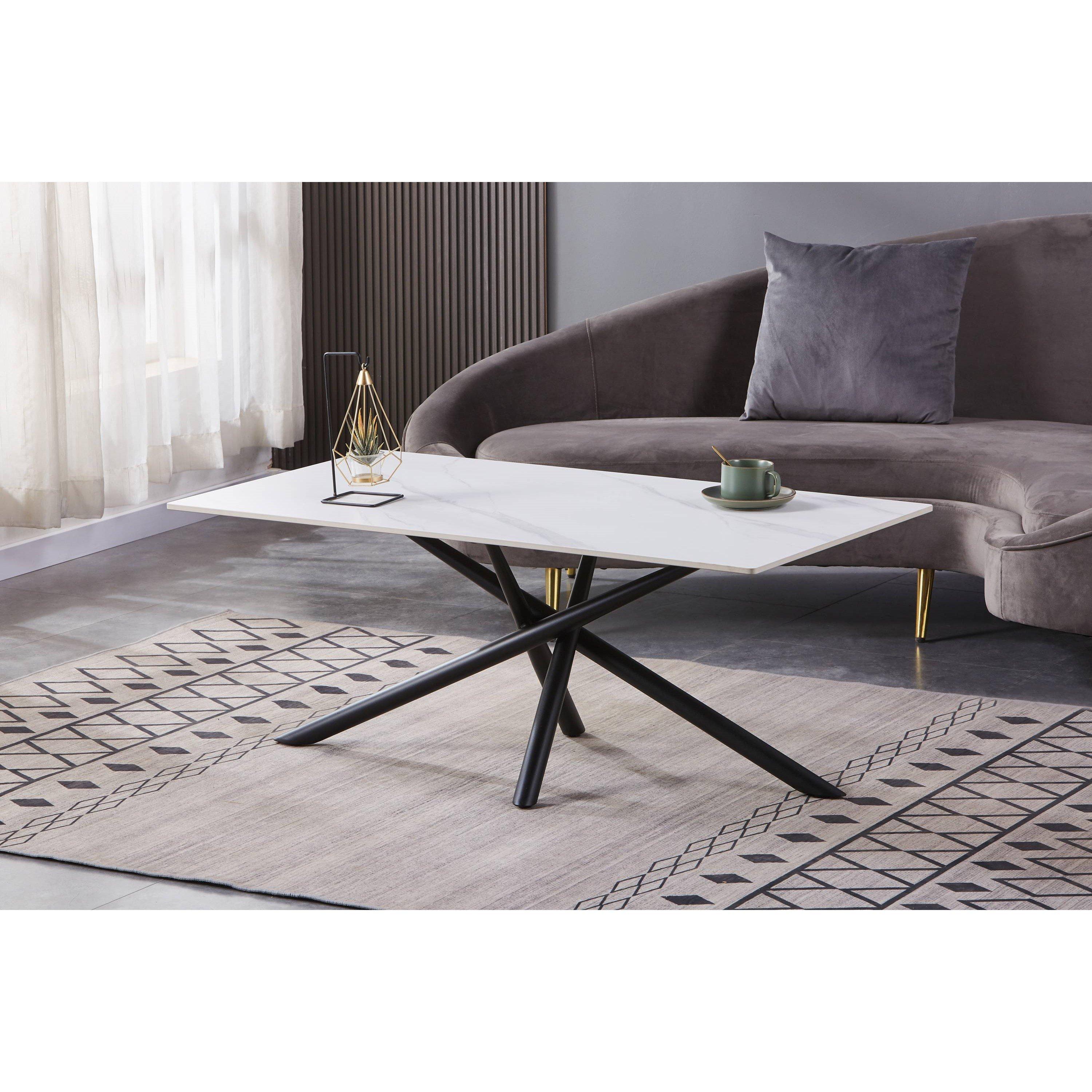 This sleek and contemporary rectangular coffee table combines a ceramic top with a signature overlapping leg frame. The 1.1m wood grain effect grey top or white marble effect top is supported by black powder coated metal cross-frame legs. Assembly required.