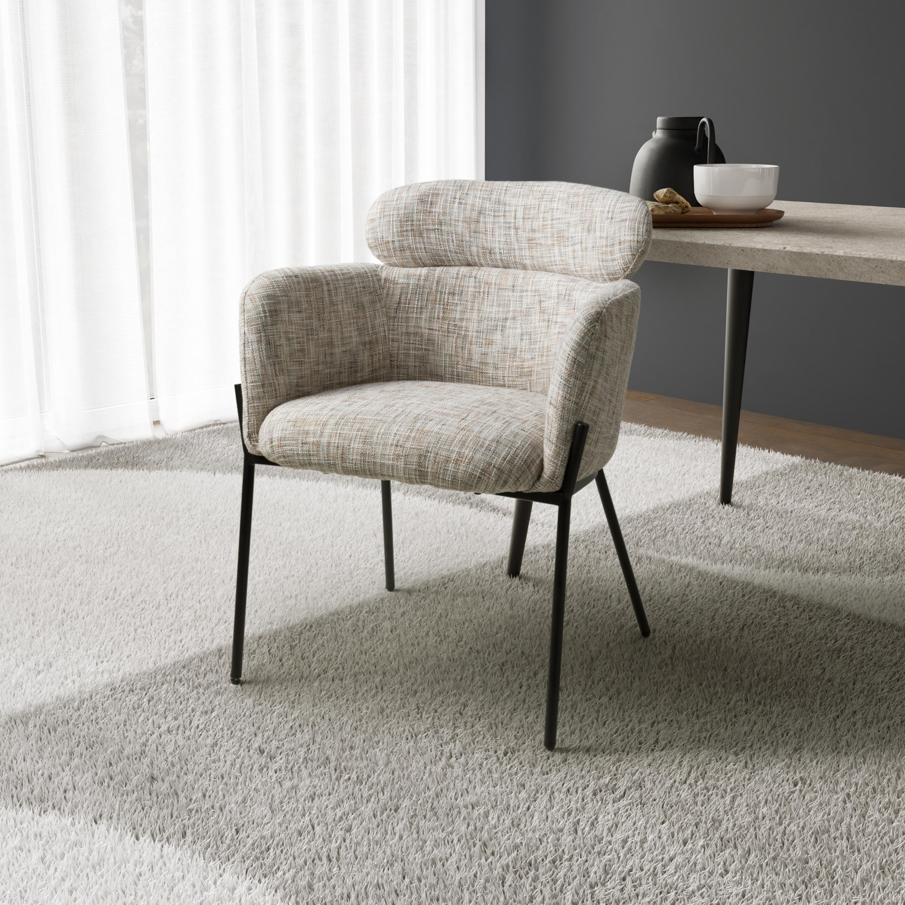 This understated contemporary accent chair comes in a stunning multi-tonal textured woven toffee or moss heather coloured fabric. The generous bucket seat provides extreme comfort, and is complimented by high armrests. A cylindrical headrest cushion adds an extra layer of comfort. The seat is supported by a distinctive slim and angular black metal leg frame. Assembly required. Sold in sets of 2 - Price is per pair