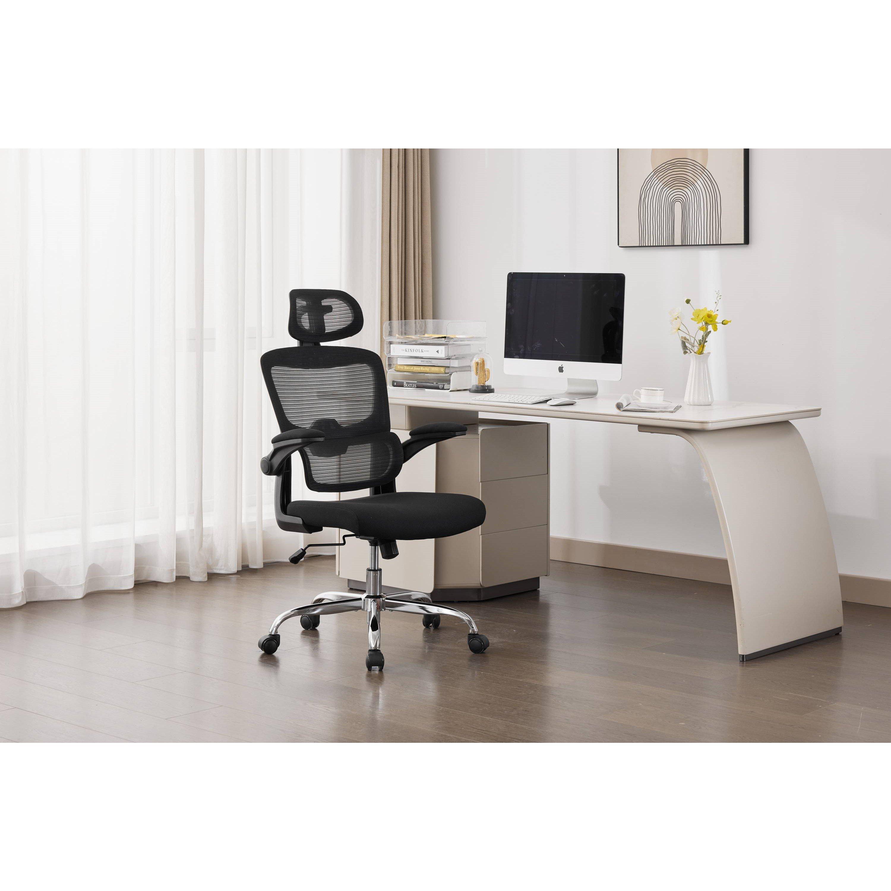 The Supreme Office Chair is upholstered in high-quality fabric and mesh. The chair features a padded seat and adjustable lumbar support. The ergonomic design includes adjustable headrest and height, with tilt mechanisms and 360 degree swivel. Equipped with sturdy dual adjustable armrests and a five-star chrome base with smooth-rolling casters, it offers both mobility and stability.