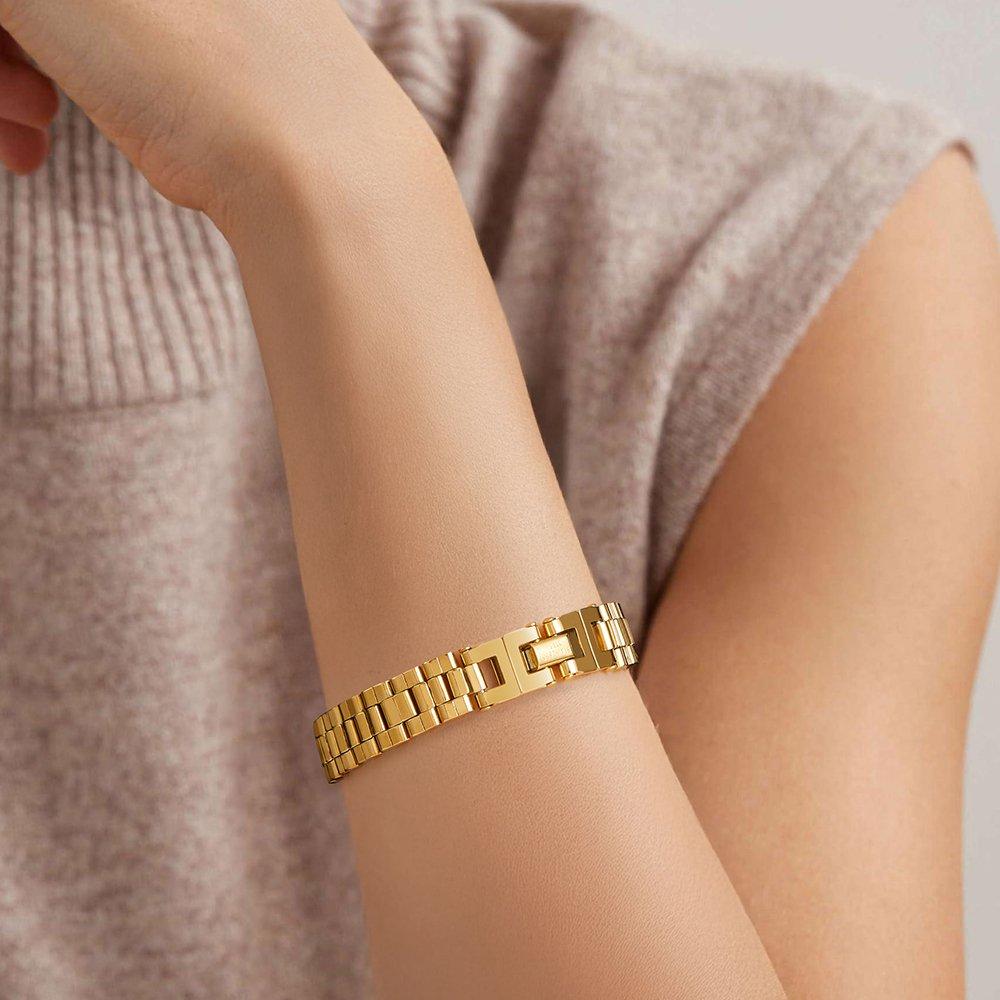 Elevate your style with this elegant gold bracelet, a perfect blend of sophistication and versatility. Expertly crafted from premium stainless steel, it offers excellent resistance to scratches and retains its shape beautifully. The refined vacuum plating technique ensures a rich, even gold finish that remains vibrant over time. With its distinctive oval link design, it exudes modern charm and classic grace, making it suitable for both formal occasions and everyday wear. It can be worn on its own or styled as a fashionable watch strap. A thoughtful gift for your mother, daughter, or someone special.