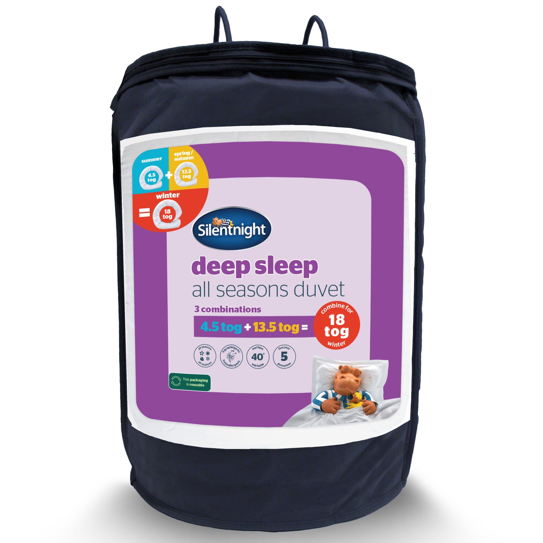 Sink into a deeper sleep, no matter the season. Whether you are a heat seeker or an over heater the Silentnight Deep Sleep All Seasons Duvet has been specially designed to help you sleep more deeply through every season. This product includes two duvets that can be used in three different combinations; 4.5 tog, 10.5 tog and 15 tog. To create the 15 tog duvet simply fasten the 4.5 tog and 10.5 tog duvets together using the poppers to create a duvet that will keep you warm and snuggly in coldest seasons. The two duvets can be used separately, use the 4.5 tog duvet in warmer summer months to keep you cool and the 10.5 tog duvet is great choice for all-year round use. This Silentnight Deep Sleep Duvet gives you the peace of mind that whatever the weather you will have the perfect duvet to help keep you at the right temperature. Silentnight are the UK’s most trusted bed brand with over 75 years’ experience in creating products for every sleeper.