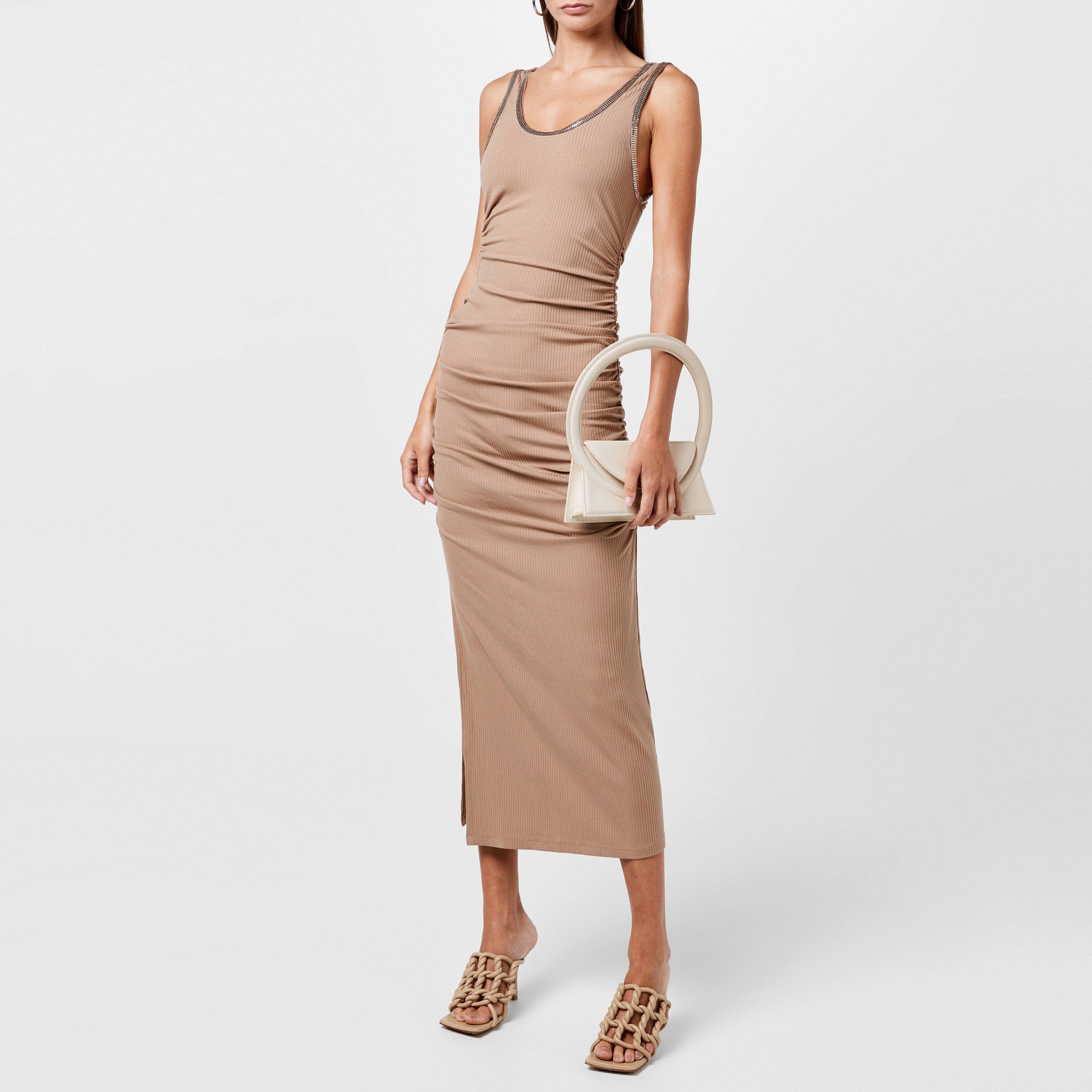 Crafted from a ribbed jersey fabrication, this dress offers a sumptuously soft and comfortable fit that caresses your silhouette. Cut in a flattering longline silhouette, the alluring cutout ruched O-ring detail on the side adds an unexpected twist, as the ruched detailing accentuates your curves. Adorning delicate shoulder straps for a feminine allure, the sparkling trim to the scoop neckline amplifies its glamour and ensures you radiate with every step you take. As you gracefully move, the side split hem falls into a maxi length, creating a fluid and elegant silhouette that exudes timeless elegance. The Darian Tank Dress is designed for those special occasions when you want to make a statement and stand out from the crowd.