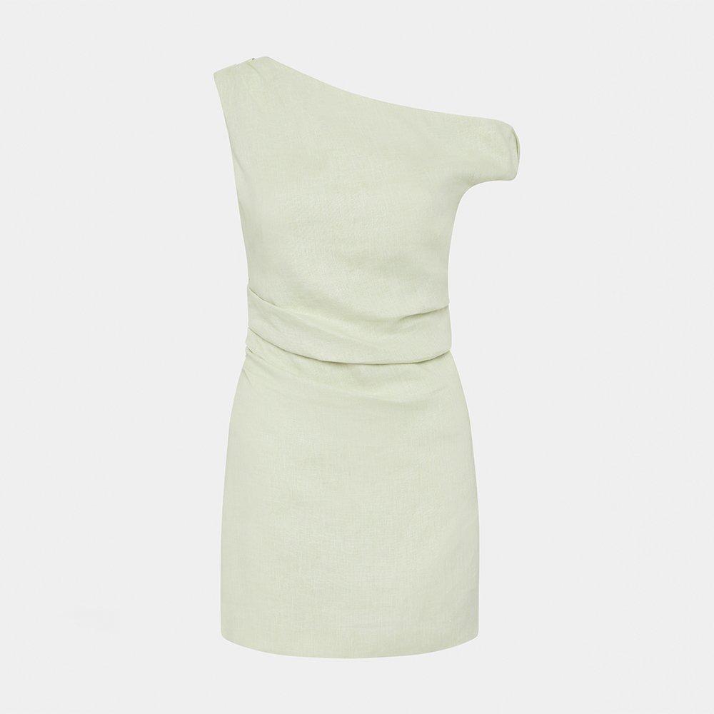 An updated best selling silhouette constructed in a thin lightweight natural fibre linen. Featuring a draped asymmetrical neckline, flattering waist gathers and an off shoulder finish, the fully lined mini dress is the perfect dress for all special summer occasions, day or night.