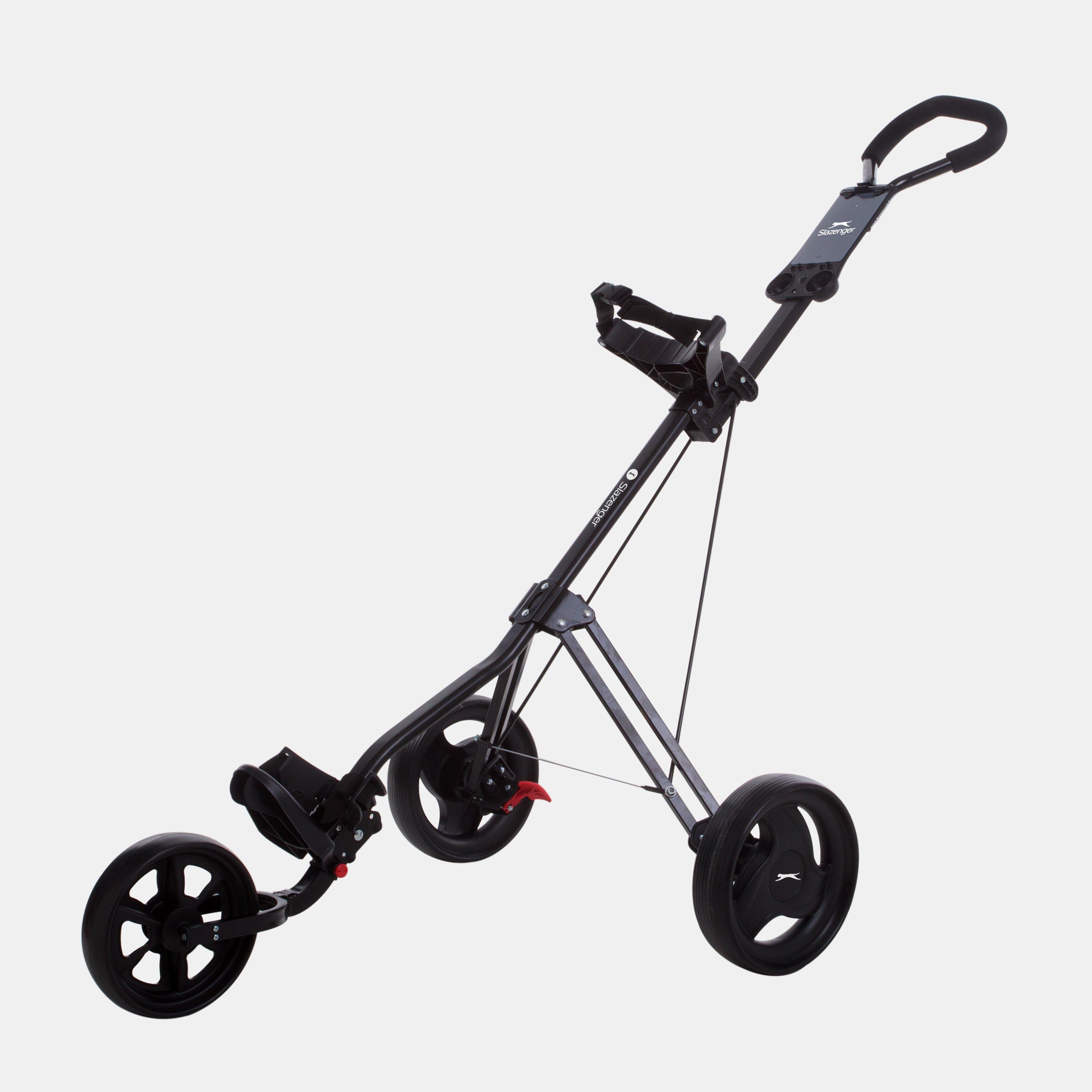 Slazenger 3 Wheel Golf Trolley The 3 Wheel Golf Trolley from Slazenger is a great choice to take on the course. This push cart is designed with 3 wheels, a multi-functional score card holder, a foot operated brake and folding wheels for great storage.