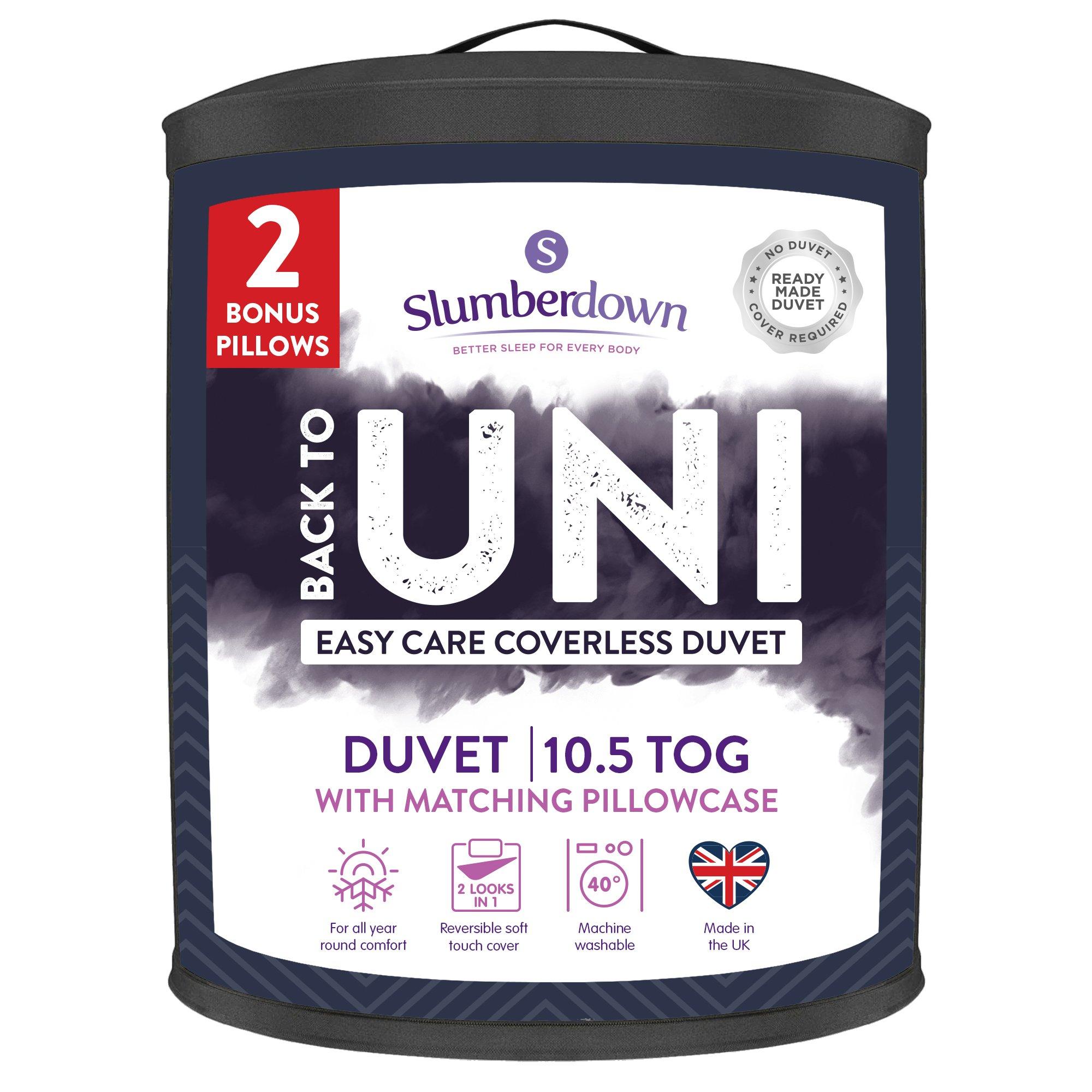 This Slumberdown Bundle is the ideal bedding set for convenience and ease. This bundle includes a Coverless Comfort duvet, two medium support pillows and matching pillowcases, it eliminates the need for fighting with duvet covers and ensures your bed is ready for sleeping in within minutes. It’s super-soft, sewn-on cover design is available in a variety of colours allowing you to customise your room by just flipping it over. Its bouncy hollowfibre filling has been packed to give you the perfect 10.5 Tog Duvet. Like the duvet the 2 Medium Support pillows have a super-soft cover which encase rebounding hollowfibre, making them ideal for back sleepers.