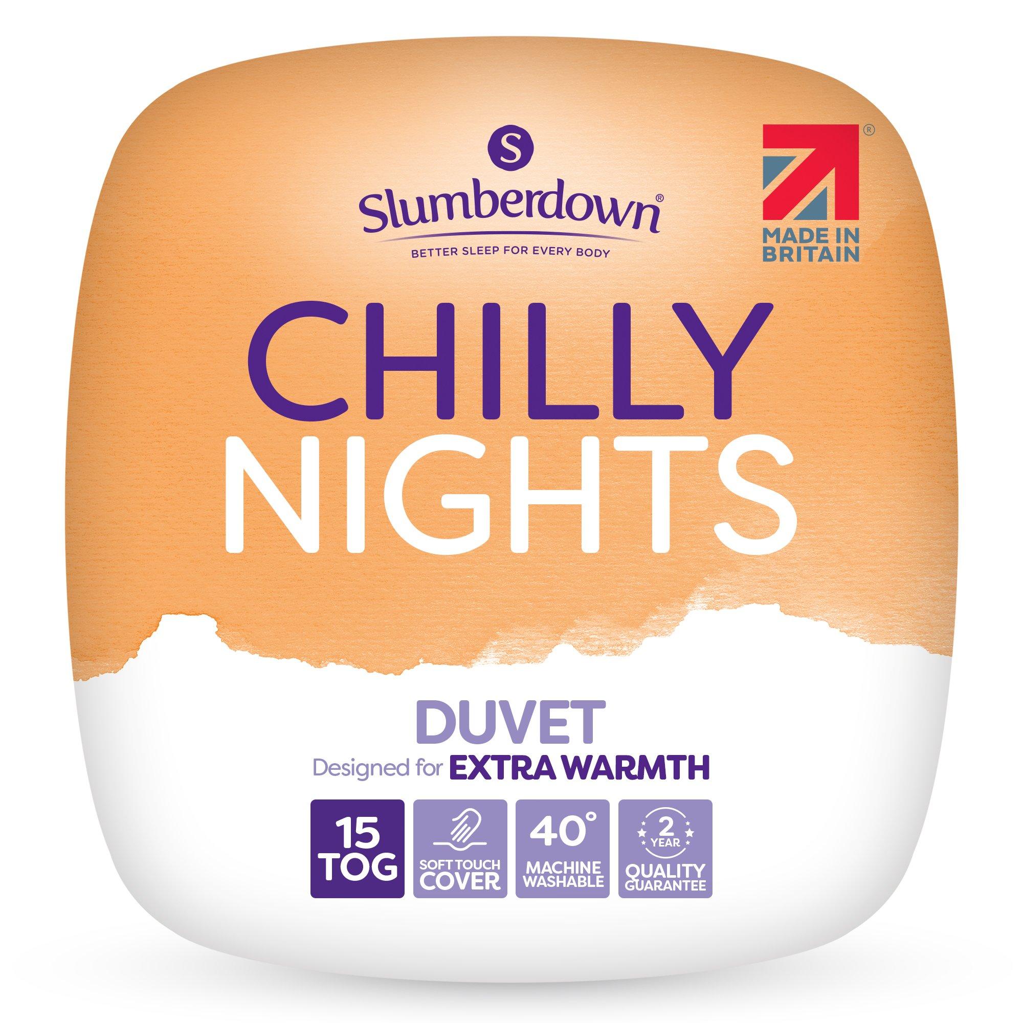 Slumberdown Chilly Nights Duvet offers you extra warmth, ma it the perfect choice for staying toasty on the chilliest of winter nights. This duvet features a soft hollow fibre filling that surround you with a cosy comfy feeling so you can enjoy great night's sleep all night long. Our soft touch cover has a smooth finish, so you can feel cosy and comfy, when snuggling into bed to enjoy a great night's sleep and wake up feeling refreshed. Non allergenic. Made in the UK.