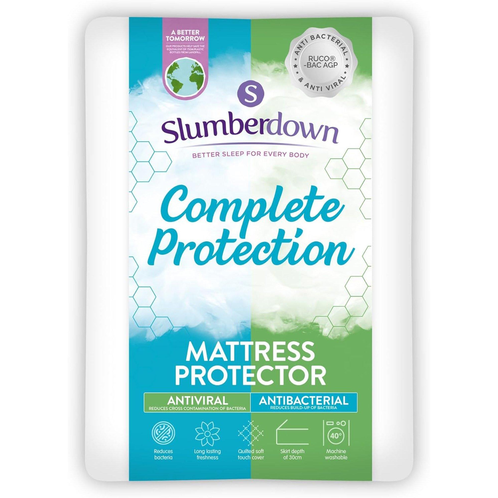 This Slumberdown Complete Protection Antiviral Mattress Protector has been specifically made with an innovative fast-acting antibacterial and antiviral treatment. Developed and independently tested by the experts at the Rudolf Group, this clever mattress protector helps to reduce the build-up and cross-contamination of bacteria and enveloped-virus, so that you can enjoy long-lasting freshness and a healthy sleep space. RUCO®-BAC AGP is proven to reduce tested viruses in the coronaviradae family by 99%, even after numerous washes, as per the international standard ISO18184:2019. Registered microstructures within the fabric of the pillow transport silver ions that stop the growth and cross-contamination of bacteria and viruses on any textile. The comfortable soft touch microfibre cover feels wonderfully cosy, and as well as providing protection against bacteria and enveloped virus, this Complete Protection mattress protector from Slumberdown also helps to prolong the life of your mattress and protect it from sweat, makeup, and any other stains or spills.