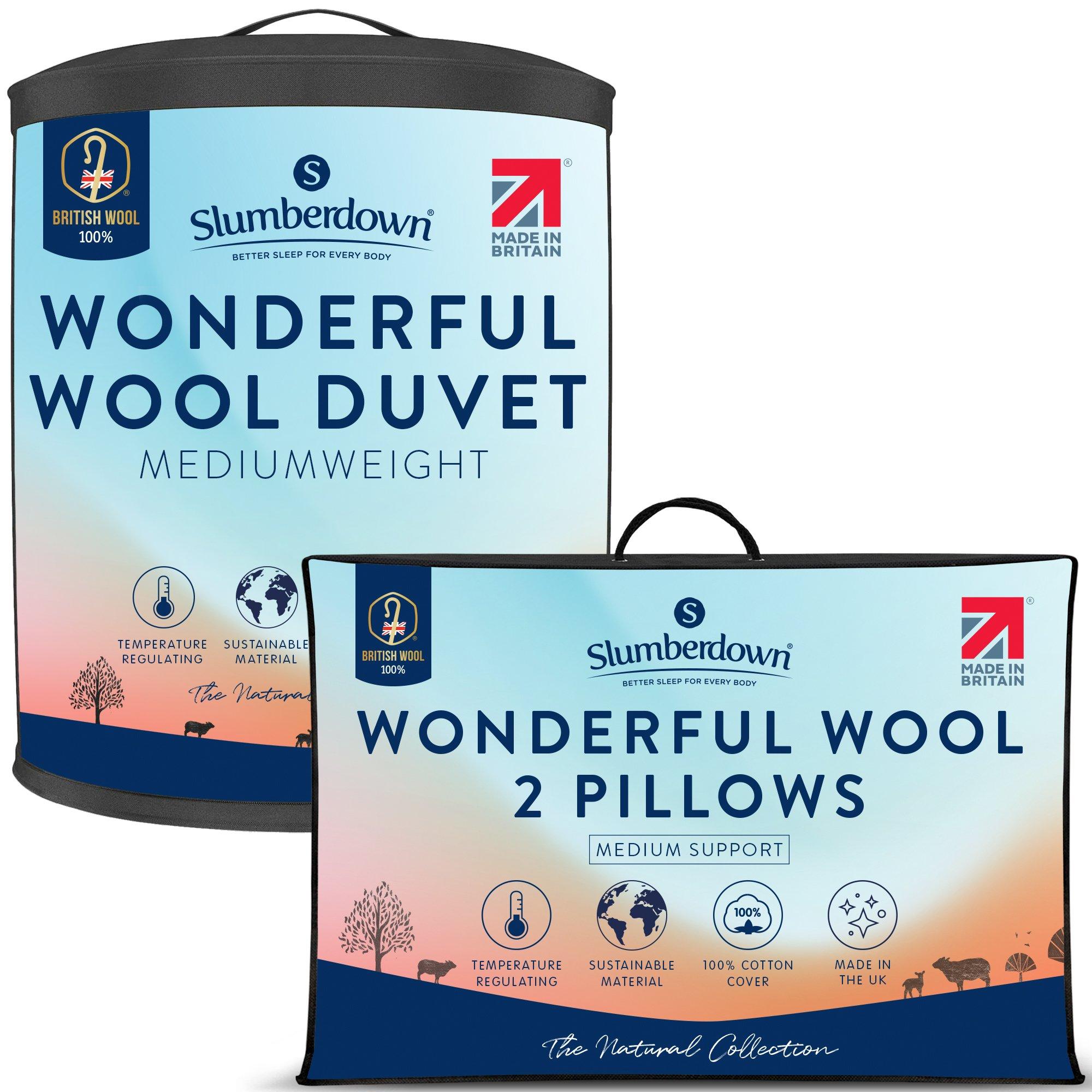 This Slumberdown Wonderful Wool Duvet is filled with 100% British wool. Wool fibres act like a spring, meaning they can continuously resist pressure and flattening and still bounce back, which makes wool a perfect filling for duvets. Wool fibre is incredibly complex and made up of lots of different layers which create pockets that trap air and help to circulate heat, enhancing insulation and warmth. It absorbs the sweat we produce during the night, then releases it when the atmosphere is dry, keeping skin dry and comfortable. As well as this, wool breathes naturally and constantly adjusts to external conditions, which helps to regulate temperature and ensure comfort. All these characteristics make this single Wonderful Wool duvet from Slumberdown a great choice for all seasons. To enhance the effects of this impressive filling, the Wonderful Wool duvet has a 100% cotton cover. Also naturally breathable, the cotton ensures that the benefits of the wool filling are not lost – working harmoniously together to deliver an optimum sleep environment for you all year round. Slumberdown Wonderful Wool Pillow is filled with 100% British wool. With a breathable 233 thread count 100% cotton cover, it will help you keep cool in summer and warm in winter. This Medium-firm luxury bed pillow is ideal if you are a back or side sleeper and offers the right level of comfort to provide extra support to your head, back, neck and shoulder to help prevent any pain so you can enjoy a good night's sleep. If you struggle with night sweats, hot weather or maybe the menopause then this pillow is ideal for you.