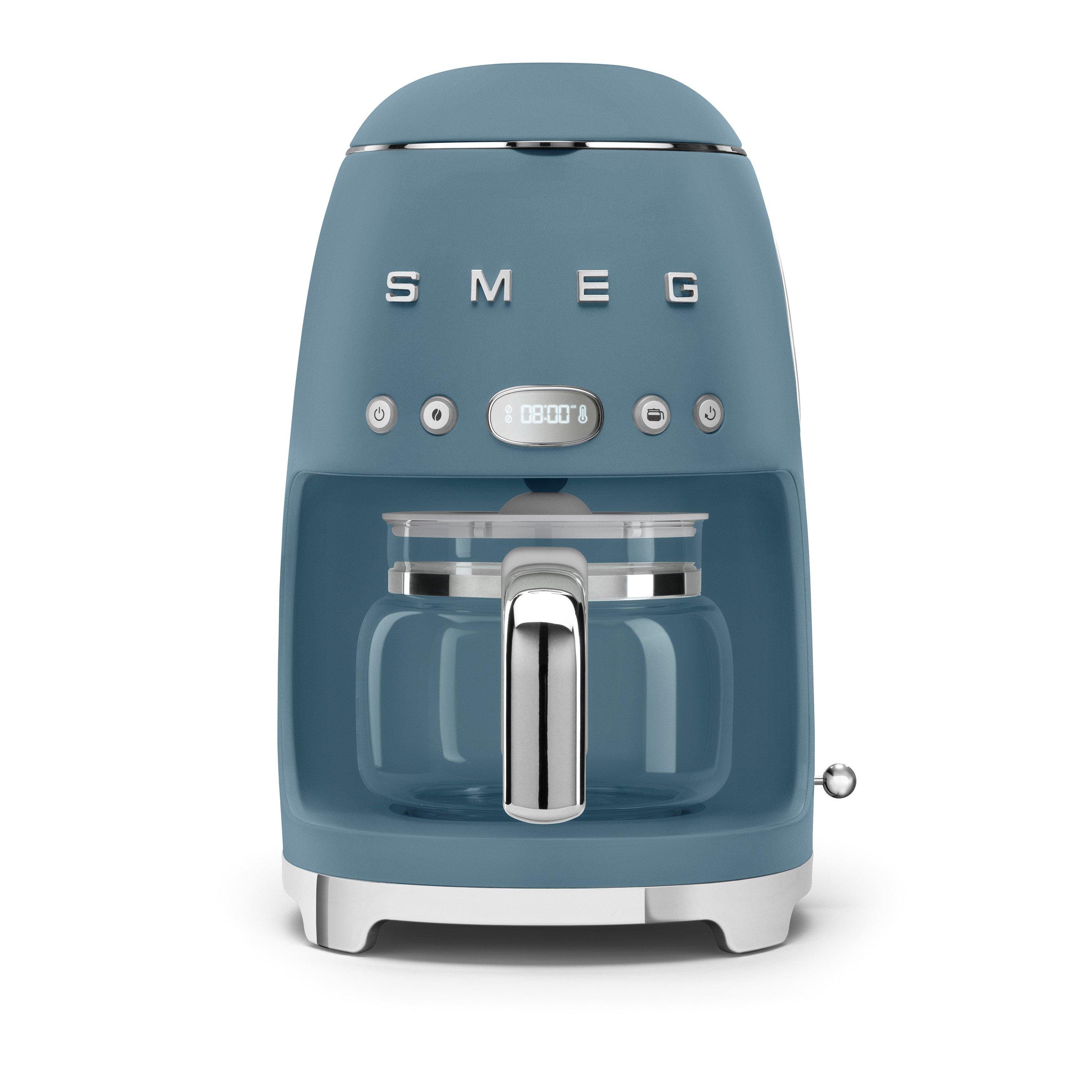 Wake up to the enticing aroma of a barista-style coffee and get your mornings started the right way with the drip coffee machine from Smeg. The 1.4 litre water tank provides up to 10 cups of delicious coffee on a single use and the handy 40 minute keep warm function will let you enjoy your drinks throughout the morning. The coffee filter is reusable and can be easily cleaned. Each function of the coffee machine is easily navigated with the user friendly control panel, while the contemporary LEDdisplay provides clear visibility of the settings and clock. This machine gives you complete control, featuring an aroma intensity button with a light or intense option, so you can make a richly-flavoured coffee at the touch of a button. The auto start mode provides more freedom to your coffee making, as you can programme the machine to commence at a given time so it's ready before starting your day. An anti-drip system helps avoid spillages, while the anti-slip feet provide added stability on your kitchen countertop.