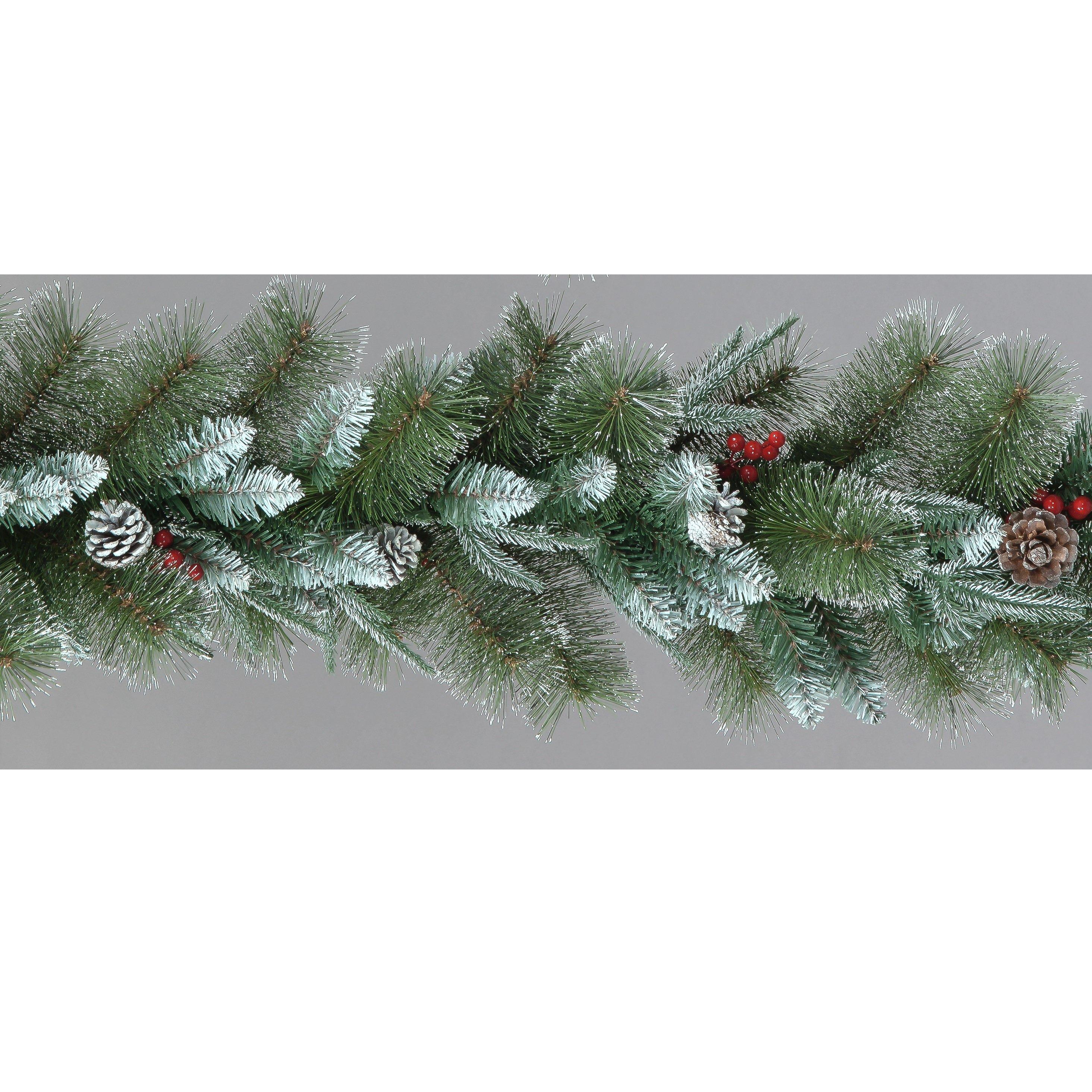 Decorated garland that is made up with a mix of 140 PE and PVC tips giving a more realistic look to your Christmas display. Decorated with cones and berries and finished with a dusting of snow. Measures 180cm in length and 25cm in diameter. Suitable for Indoor Use only.