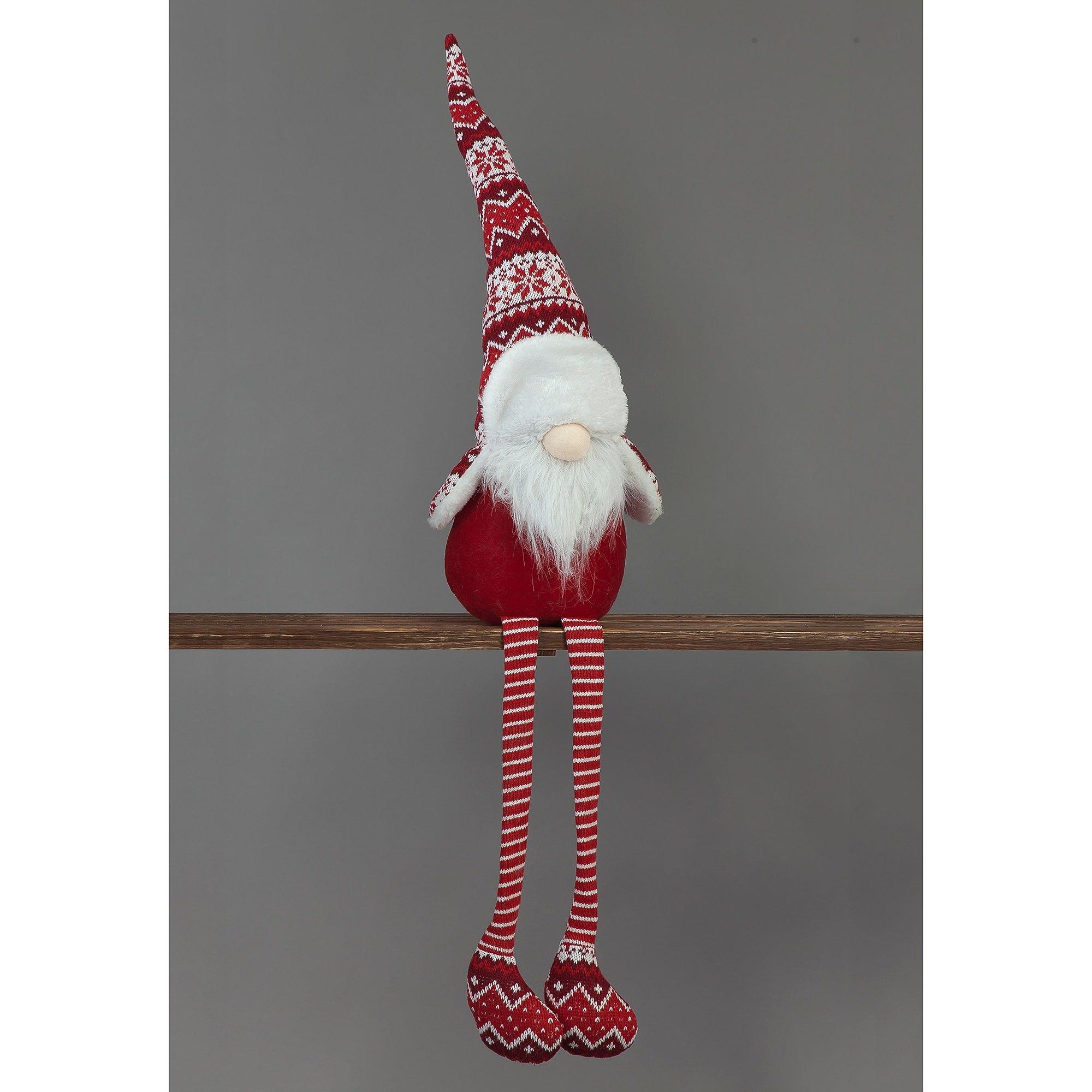 Plush Red Sitting Santa Gonk dressed in festive Christmas clothes, suitable for setting on shelves, mantels, windowsills, cabinets etc. Full length measurement 96cm, including legs, 21cm width and 15cm height. Suitable for indoor use only.
