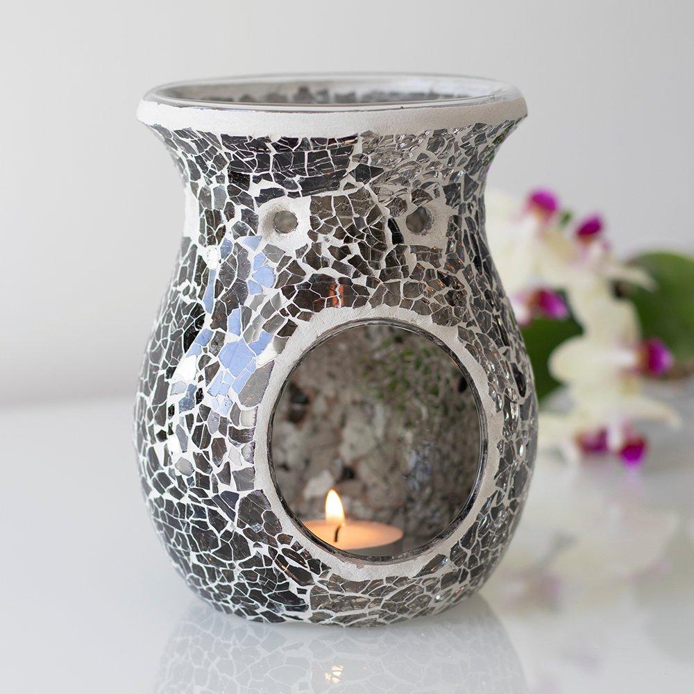 Beautiful large oil burner with a grey mirrored crackle effect. May also be used as a wax melt burner.Product Dimensions: H14cm x W11cm x D10.5cm Packaged Dimensions: H17cm x W14cm x D14cm