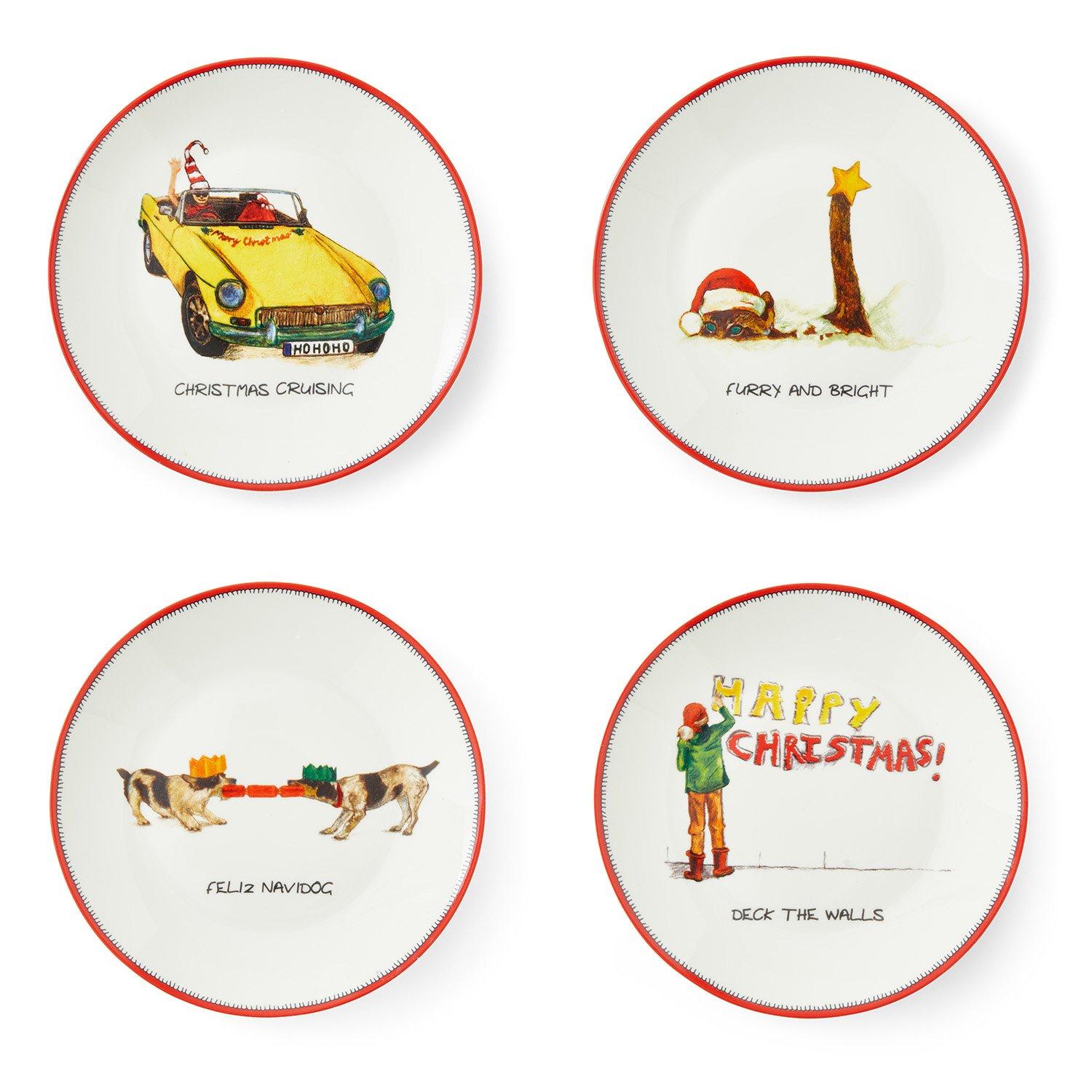 Enjoy a festive treat in style with this set of four tidbit plates from the Kit Kemp for Spode Doodles collection. Featuring four painted illustrations alongside a cheeky tagline, these fine china plates will make you and your guests smile. Presented in a red box perfect for gifting.