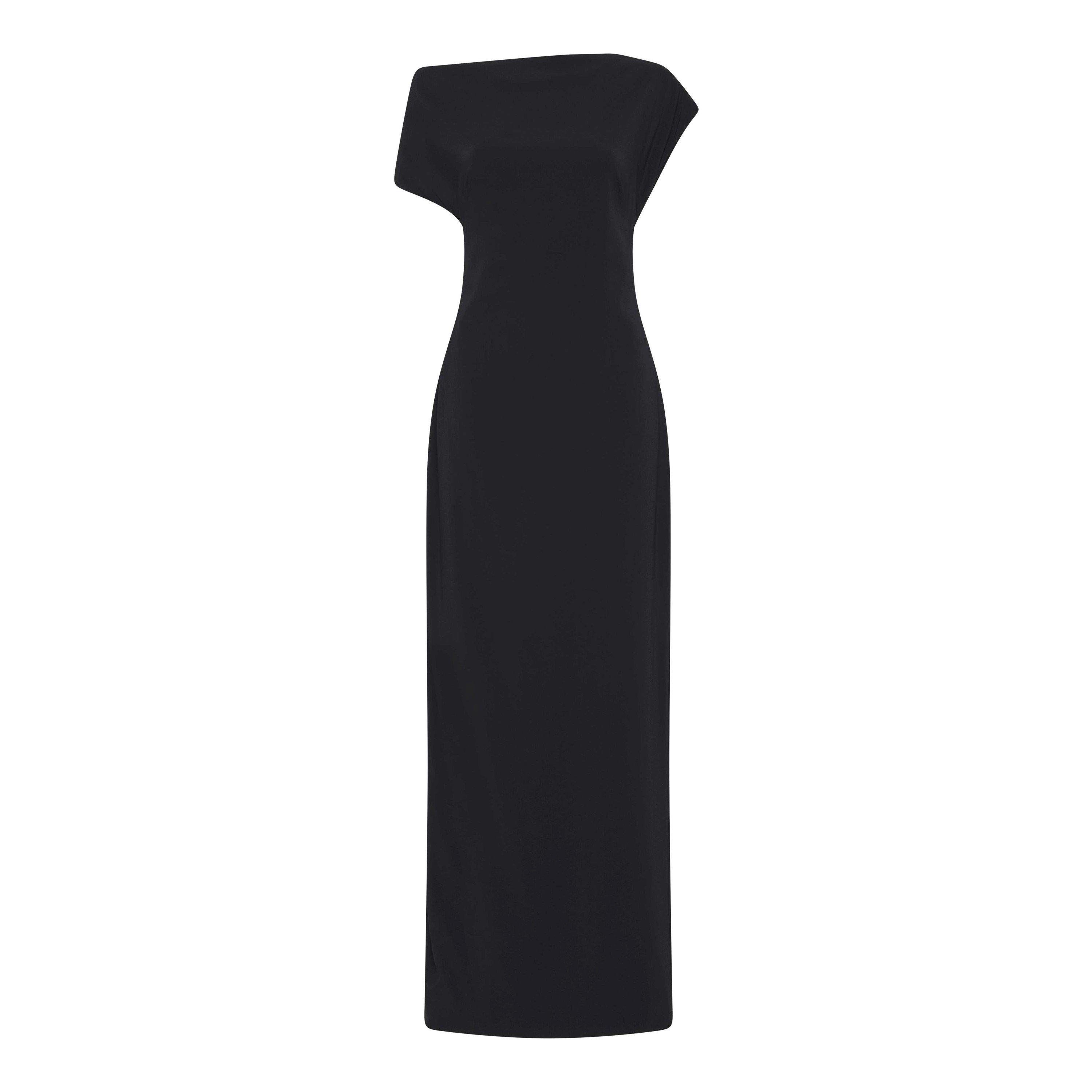 The St. Agni Asymmetric Off-Shoulder Maxi Dress features a full-length cut. The design creates an off-shoulder profile through its angled neckline.