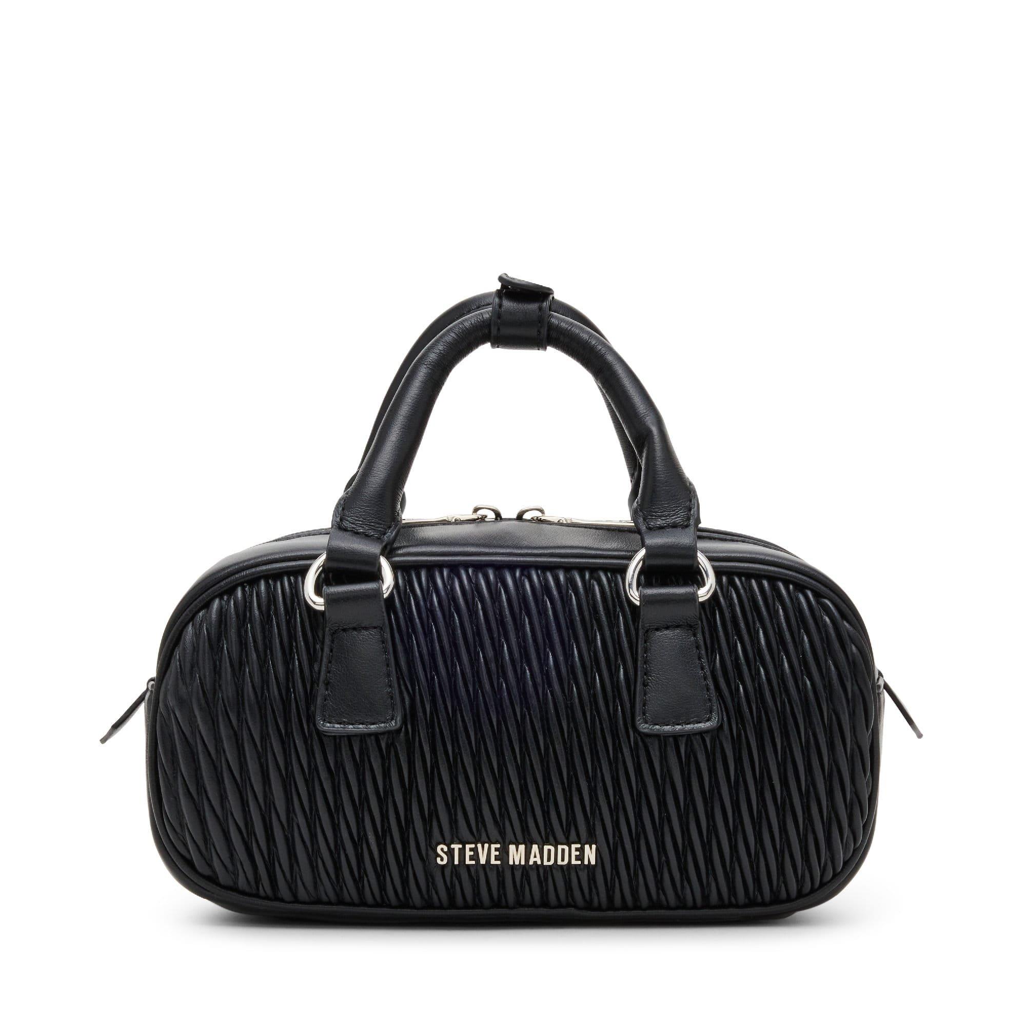 The bag is an envelope-style clutch made of black velvet with a magnetic snap closure and a gold-toned SM logo on the front. It has a detachable crossbody chain strap.
